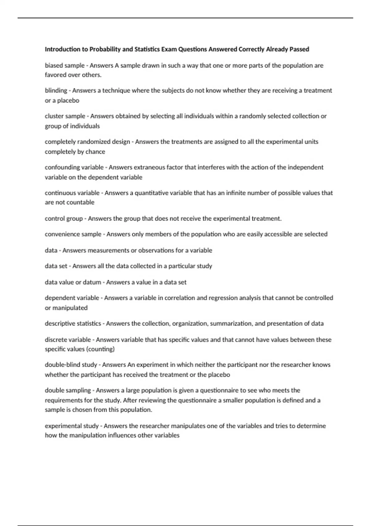 Introduction to Probability and Statistics Exam Questions Answered Correctly Already Passed biased sample - Answers A sample drawn in such a way that one or more parts of the population are favored over others. blinding - Answers a technique where the subjects do not know whether they are receiving a treatment or a placebo cluster sample - Answers obtained by selecting all individuals within a randomly selected collection or group of individuals completely randomized design - Answers the treatments are assigned to all the experimental units completely by chance confounding variable - Answers extraneous factor that interferes with the action of the independent variable on the dependent variable continuous variable - Answers a quantitative variable that has an infinite number of possible values that are not countable control group - Answers the group that does not receive the experimental treatment. convenience sample - Answers only members of the population who are easily accessible are selected data - Answers measurements or observations for a variable data set - Answers all the data collected in a particular study data value or datum - Answers a value in a data set dependent variable - Answers a variable in correlation and regression analysis that cannot be controlled or manipulated descriptive statistics - Answers the collection, organization, summarization, and presentation of data discrete variable - Answers variable that has specific values and that cannot have values between these specific values (counting) double-blind study - Answers An experiment in which neither the participant nor the researcher knows whether the participant has received the treatment or the placebo double sampling - Answers a large population is given a questionnaire to see who meets the requirements for the study. After reviewing the questionnaire a smaller population is defined and a sample is chosen from this population. experimental study - Answers the researcher manipulates one of the variables and tries to determine how the manipulation influences other variables explanatory variable - Answers a variable that is being manipulated by the researcher to see if it affects the outcome variable Hawthorne effect - Answers A change in a subject's behavior caused simply by the awareness of being studied hypothesis testing - Answers a decision-making process for evaluating claims about a population independent variable - Answers The experimental factor that is manipulated; the variable whose effect is being studied. inferential statistics - Answers generalizing from samples to populations, performing estimations and hypothesis tests, determining relationships among variables, and making predictions interval level of measurement - Answers a measurement level that ranks data and in which precise differences between units of measure exist matched pairs design - Answers A method of assigning subjects to groups in which pairs of subjects are first matched on some characteristic and then individually assigned randomly to groups. measurement scales - Answers nominal, ordinal, interval, ratio Monte Carlo Method - Answers simulation technique using random numbers nominal level of measurement - Answers characterized by data that consist of names, labels, or categories only, and the data cannot be arranged in an ordering scheme (such as low to high) observational study - Answers a study based on data in which no manipulation of factors has