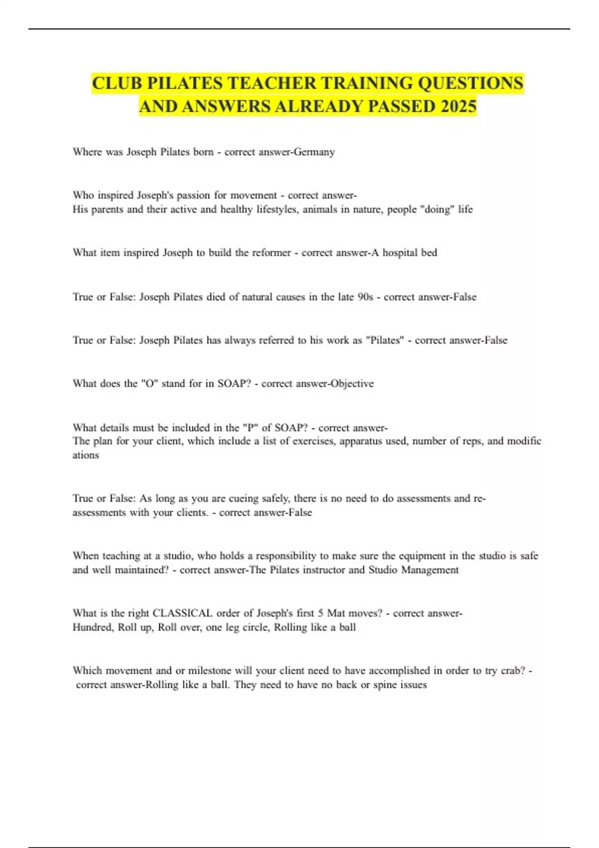 CLUB PILATES TEACHER TRAINING QUESTIONS AND ANSWERS ALREADY PASSED 2025