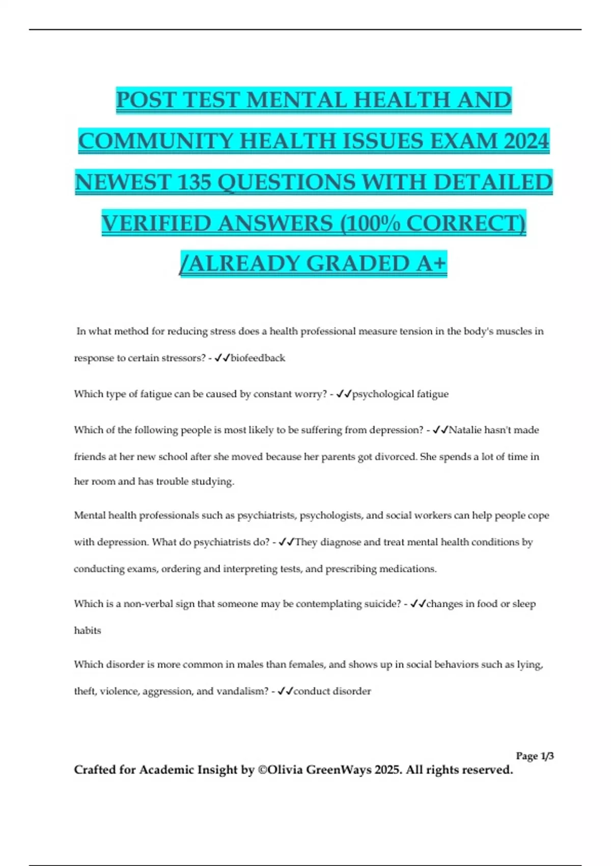 POST TEST MENTAL HEALTH AND COMMUNITY HEALTH ISSUES EXAM 2024 NEWEST 135 QUESTIONS WITH DETAILED VERIFIED ANSWERS (100% CORRECT) /ALREADY GRADED A+ In what method for reducing stress does a health professional measure tension in the body's muscles in response to certain stressors? - biofeedback Which type of fatigue can be caused by constant worry? - psychological fatigue Which of the following people is most likely to be suffering from depression? - Natalie hasn't made friends at her new school after she moved because her parents got divorced. She spends a lot of time in her room and has trouble studying. Mental health professionals such as psychiatrists, psychologists, and social workers can help people cope with depression. What do psychiatrists do? - They diagnose and treat mental health conditions by conducting exams, ordering and interpreting tests, and prescribing medications. Which is a non-verbal sign that someone may be contemplating suicide? - changes in food or sleep habits Which disorder is more common in males than females, and shows up in social behaviors such as lying, theft, violence, aggression, and vandalism? - conduct disorder