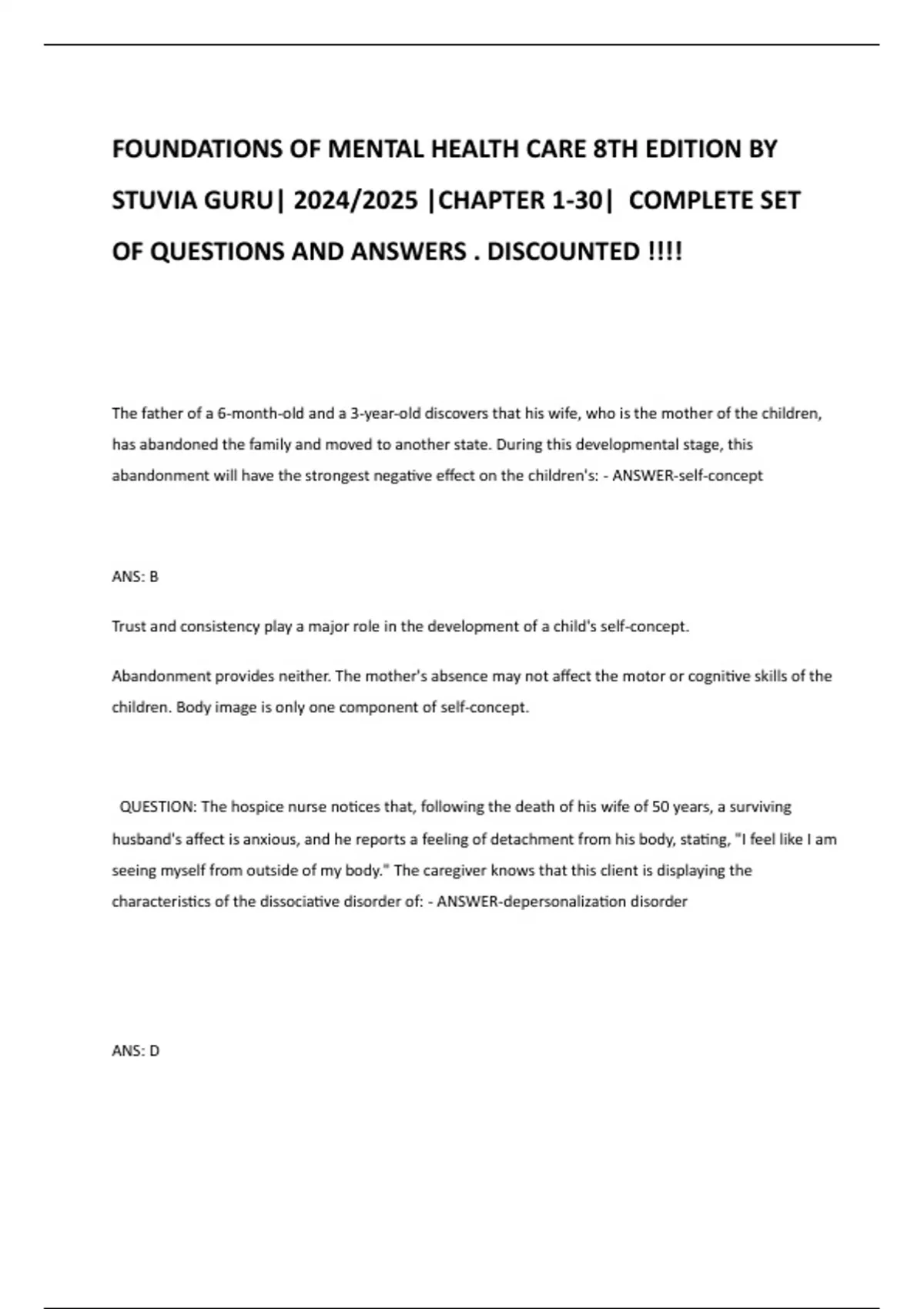 FOUNDATIONS OF MENTAL HEALTH CARE 8TH EDITION BY STUVIA GURU| 2024/2025 |CHAPTER 1-30| COMPLETE SET OF QUESTIONS AND ANSWERS . DISCOUNTED !!!!