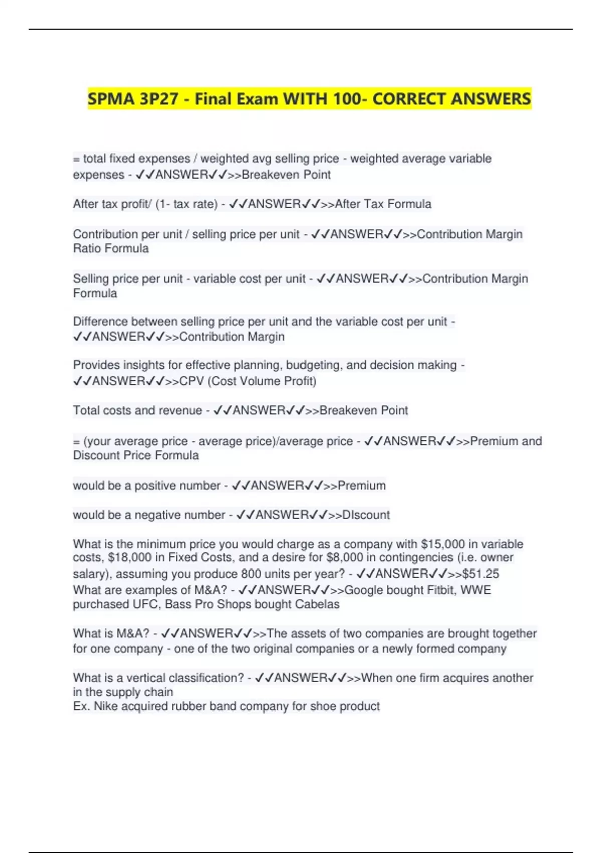 SPMA 3P27 - Final Exam WITH 100- CORRECT ANSWERS = total fixed expenses / weighted avg selling price - weighted average variable expenses - ANSWERBreakeven Point
