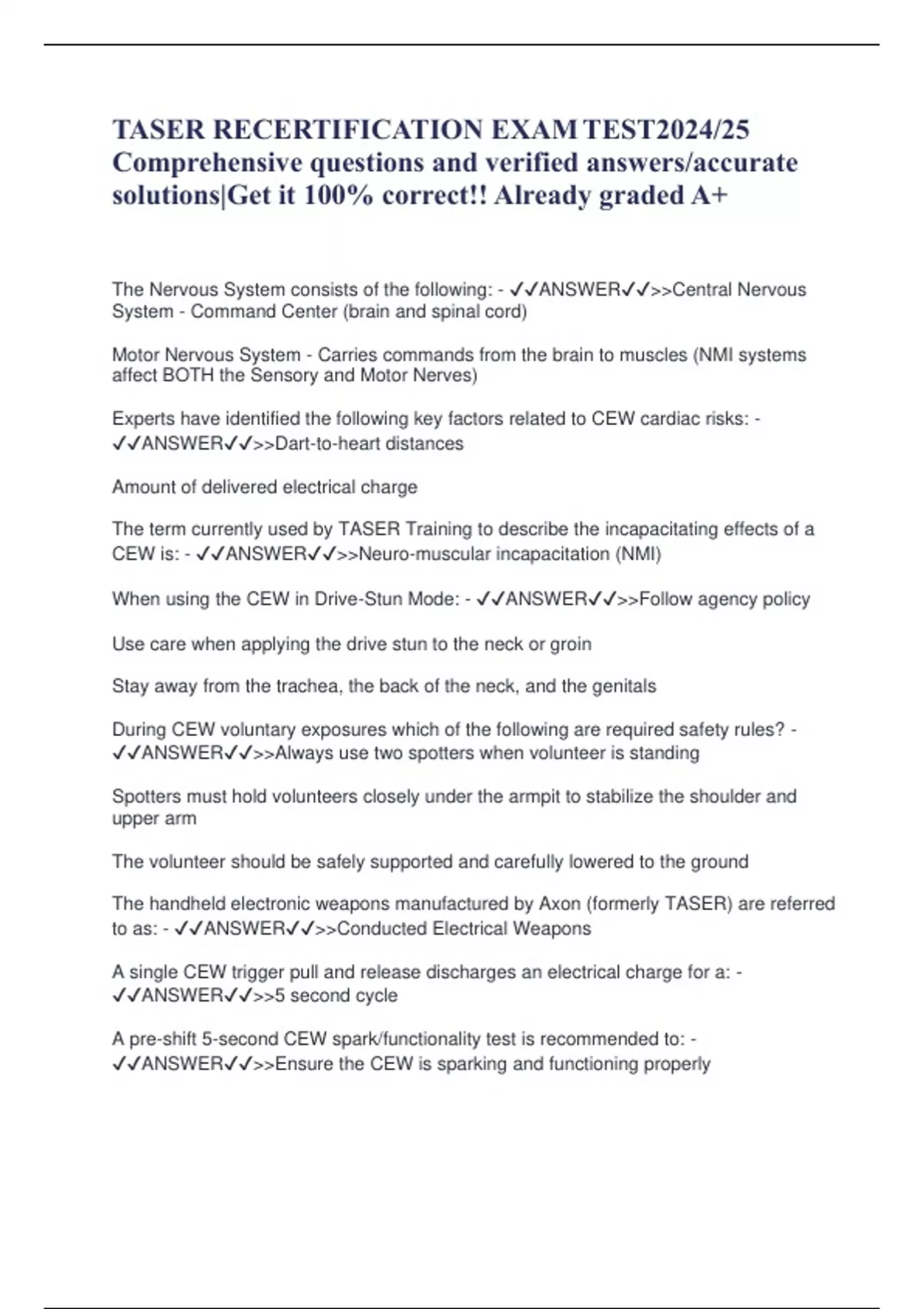 TASER RECERTIFICATION EXAMTEST2024/25 Comprehensive questions and verified answers/accurate solutions|Get it 100% correct!! Already graded A+ The Nervous System consists of the following: - ANSWERCentral Nervous System - Command Center (brain and spinal cord) Motor Nervous System - Carries commands from the brain to muscles (NMI systems affect BOTH the Sensory and Motor Nerves) Experts have identified the following key factors related to CEW cardiac risks: - ANSWERDart-to-heart distances