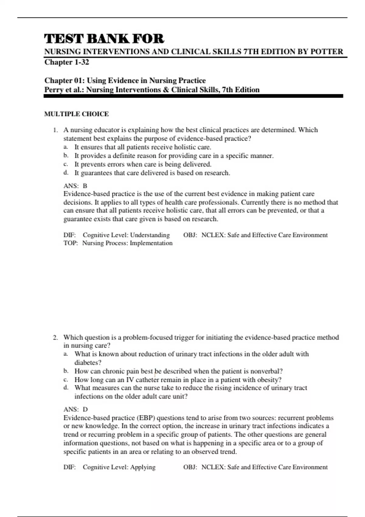 TEST BANK FOR NURSING INTERVENTIONS AND CLINICAL SKILLS 7TH EDITION BY POTTER Chapter 1-32