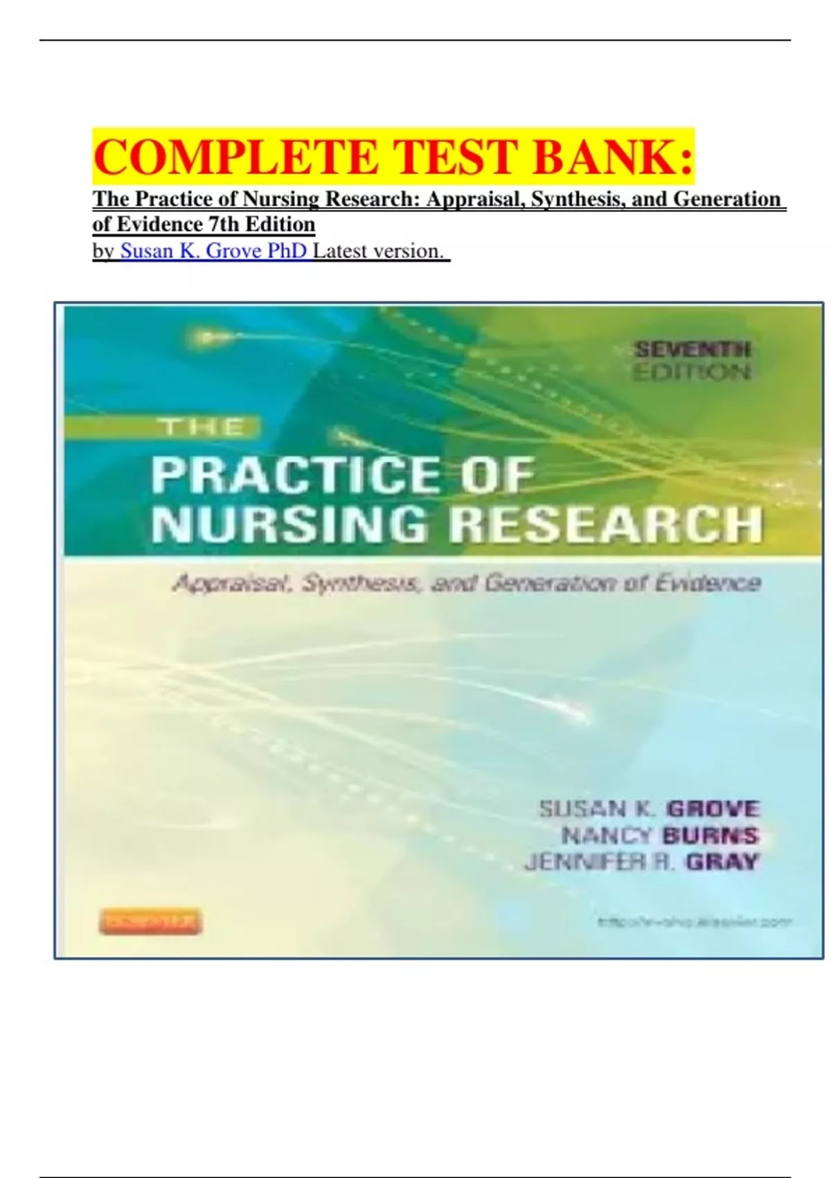 COMPLETE TEST BANK: The Practice of Nursing Research: Appraisal, Synthesis, and Generation of Appraisal, Synthesis, and Generation of Evidence 7th Edition by Susan K. Grove PhD Latest version.