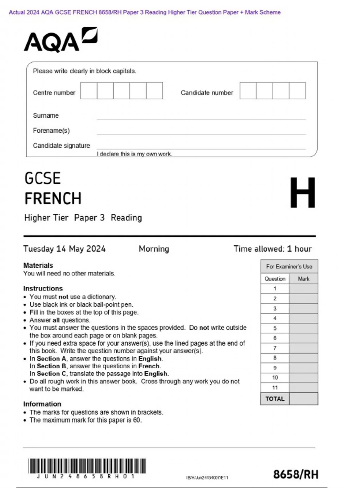 Actual 2024 AQA GCSE FRENCH 8658/RH Paper 3 Reading Higher Tier Question Paper + Mark Scheme