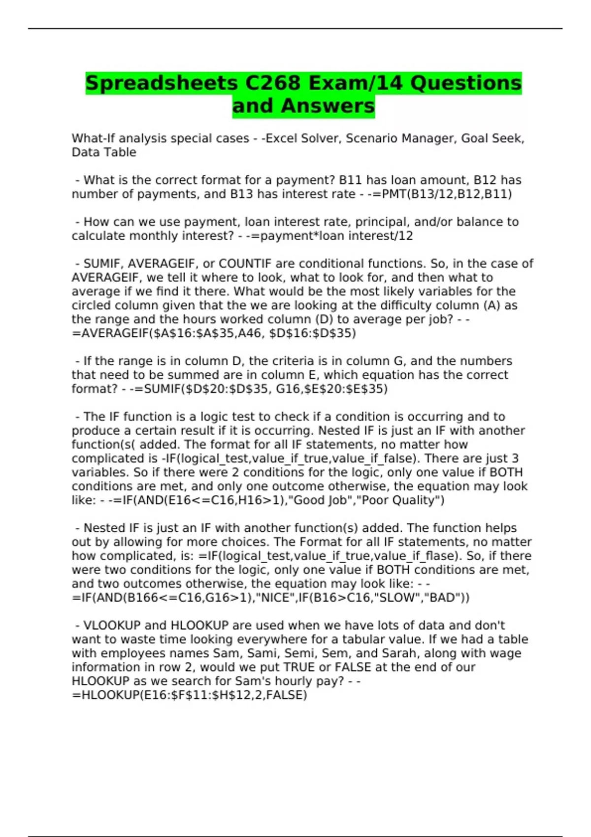 Spreadsheets C268 Exam/14 Questions