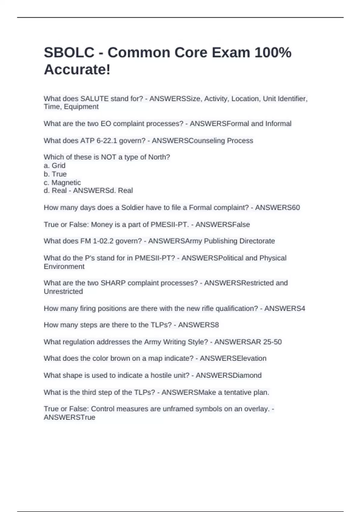What does SALUTE stand for? - ANSWERSSize, Activity, Location, Unit Identifier, Time, Equipment What are the two EO complaint processes? - ANSWERSFormal and Informal What does ATP 6-22.1 govern? - ANSWERSCounseling Process Which of these is NOT a type of North? a. Grid b. True c. Magnetic d. Real - ANSWERSd. Real How many days does a Soldier have to file a Formal complaint? - ANSWERS60 True or False: Money is a part of PMESII-PT. - ANSWERSFalse What does FM 1-02.2 govern? - ANSWERSArmy Publishing Directorate What do the P's stand for in PMESII-PT? - ANSWERSPolitical and Physical Environment What are the two SHARP complaint processes? - ANSWERSRestricted and Unrestricted How many firing positions are there with the new rifle qualification? - ANSWERS4 How many steps are there to the TLPs? - ANSWERS8 What regulation addresses the Army Writing Style? - ANSWERSAR 25-50 What does the color brown on a map indicate? - ANSWERSElevation What shape is used to indicate a hostile unit? - ANSWERSDiamond
