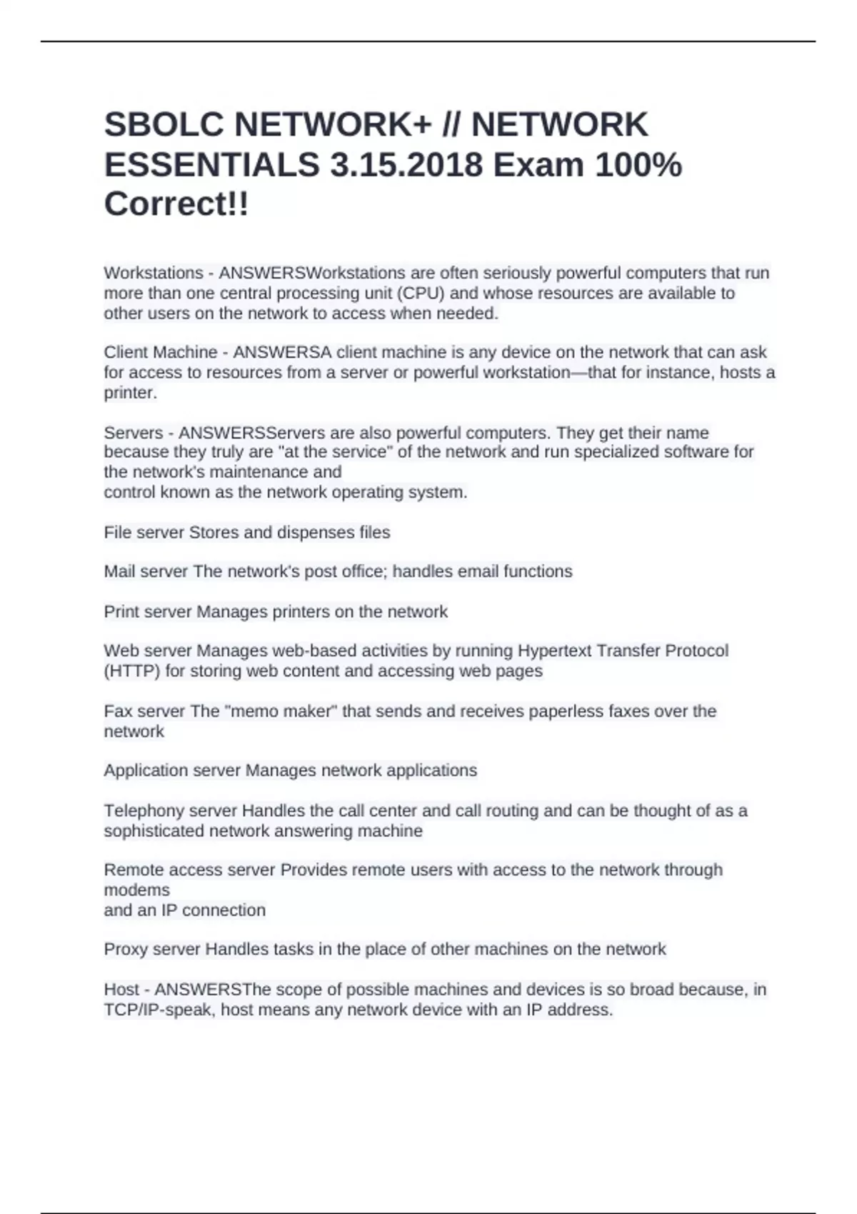 SBOLC NETWORK+ // NETWORK ESSENTIALS 3.15.2018 Exam 100% Correct!!