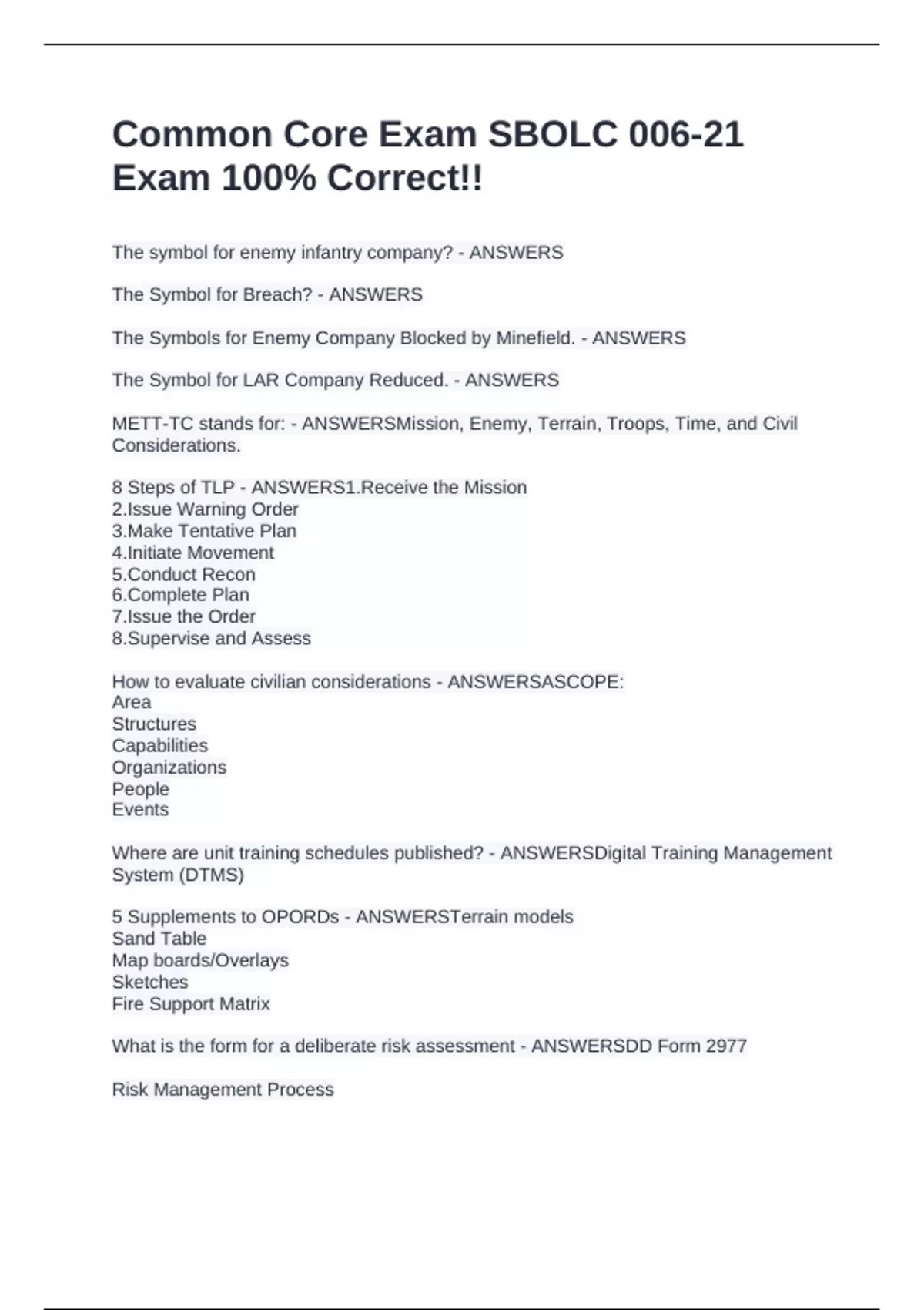 The symbol for enemy infantry company? - ANSWERS The Symbol for Breach? - ANSWERS The Symbols for Enemy Company Blocked by Minefield. - ANSWERS The Symbol for LAR Company Reduced. - ANSWERS METT-TC stands for: - ANSWERSMission, Enemy, Terrain, Troops, Time, and Civil Considerations. 8 Steps of TLP - ANSWERS1.Receive the Mission 2.Issue Warning Order 3.Make Tentative Plan 4.Initiate Movement 5.Conduct Recon 6.Complete Plan 7.Issue the Order 8.Supervise and Assess How to evaluate civilian considerations - ANSWERSASCOPE: Area Structures Capabilities Organizations People Events Where are unit training schedules published? - ANSWERSDigital Training Management System (DTMS) 5 Sup