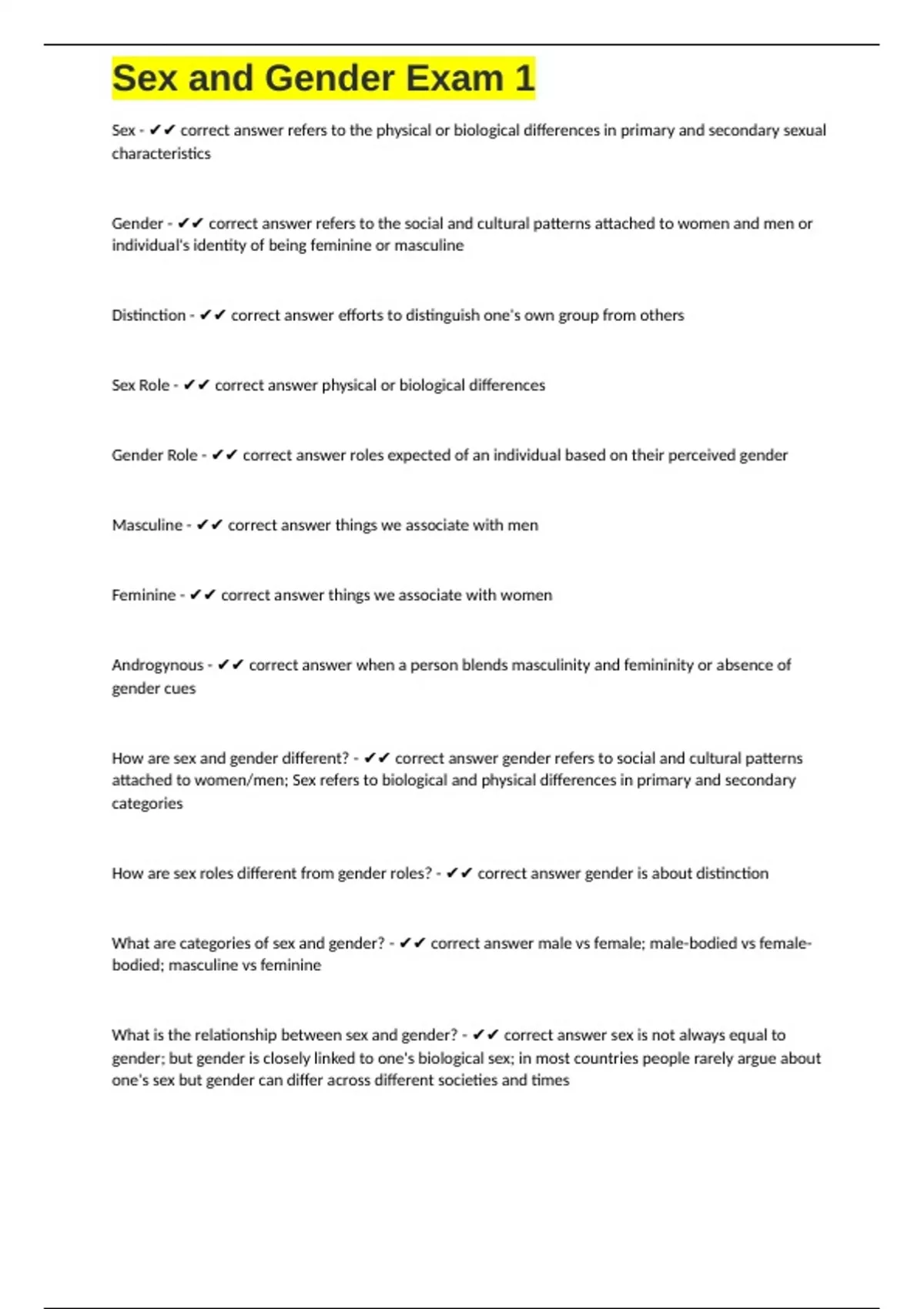 Sex and Gender Exam 1questions and complete correct answers 2024/2025