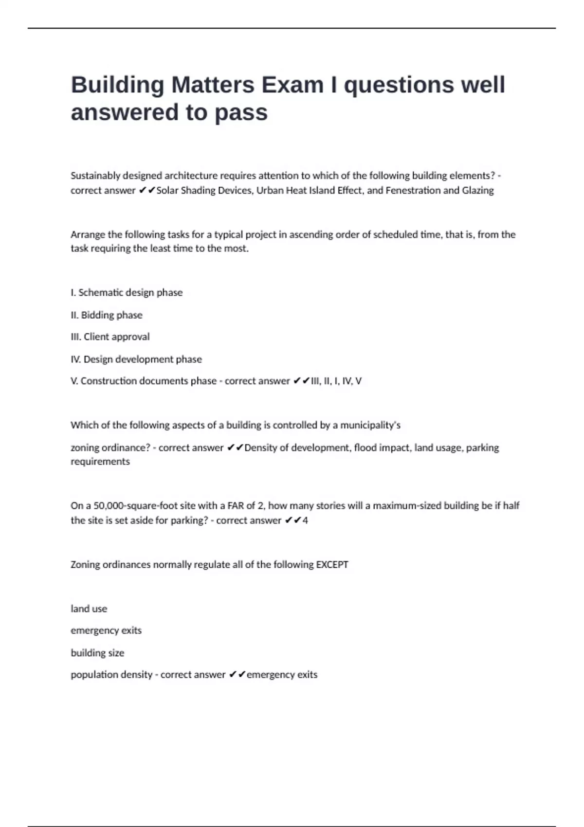 V. Construction documents phase - correct answer ✔✔III, II, I, IV, V