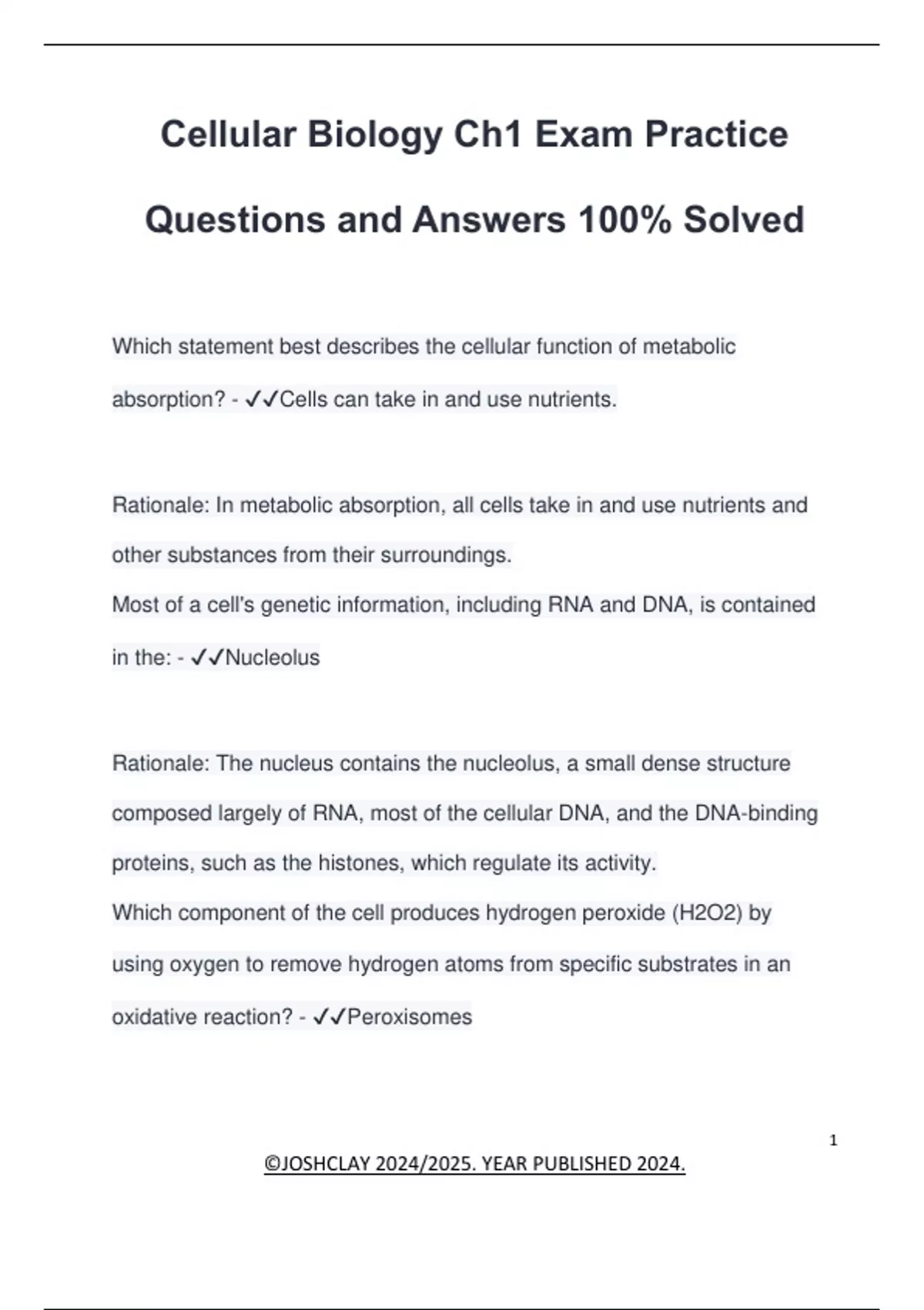 Cellular Biology Ch1 Exam Practice Questions and Answers 100% Solved Which statement best describes the cellular function of metabolic absorption? - Cells can take in and use nutrients. Rationale: In metabolic absorption, all cells take in and use nutrients and other substances from their surroundings. Most of a cell's genetic information, including RNA and DNA, is contained in the: - Nucleolus Rationale: The nucleus contains the nucleolus, a small dense structure composed largely of RNA, most of the cellular DNA, and the DNA-binding proteins, such as the histones, which regulate its activity. Which component of the cell produces hydrogen peroxide (H2O2) by using oxygen to remove hydrogen atoms from specific substrates in an oxidative reaction? - Peroxisomes
