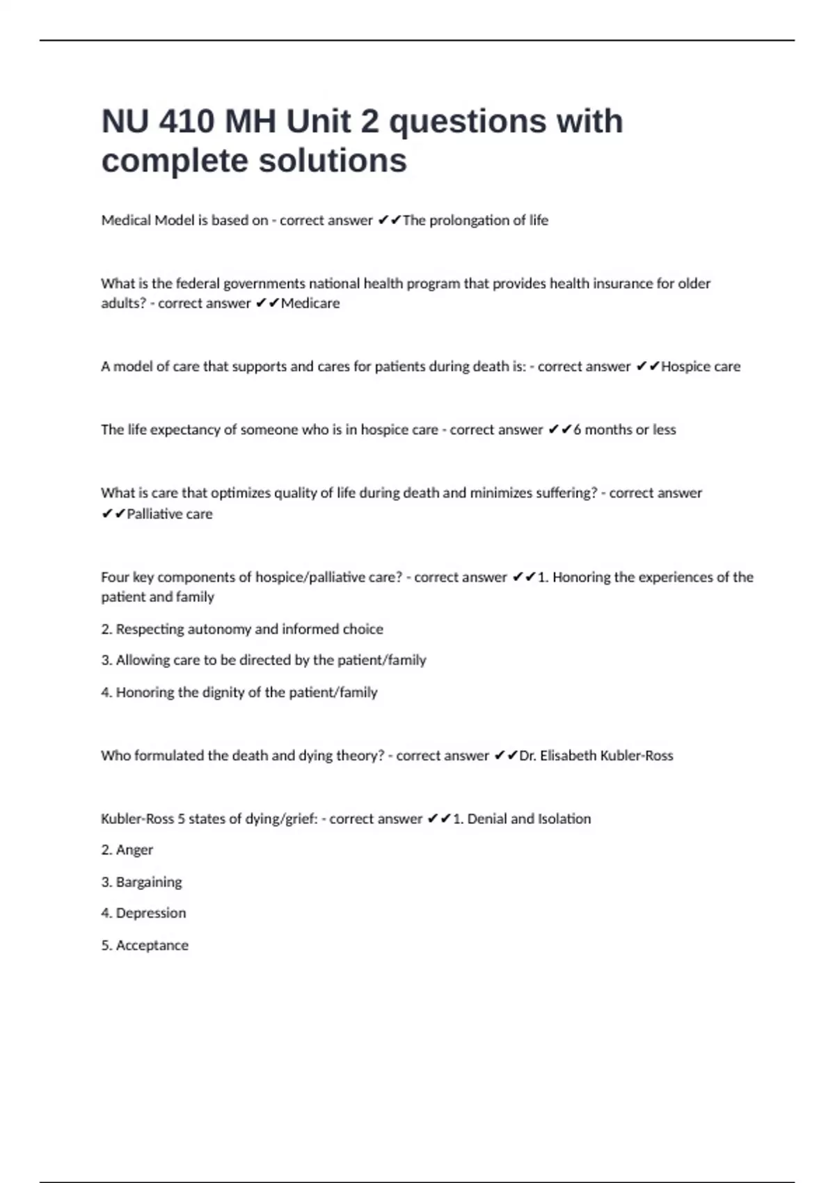 Kubler-Ross 5 states of dying/grief: - correct answer ✔✔1. Denial and Isolation