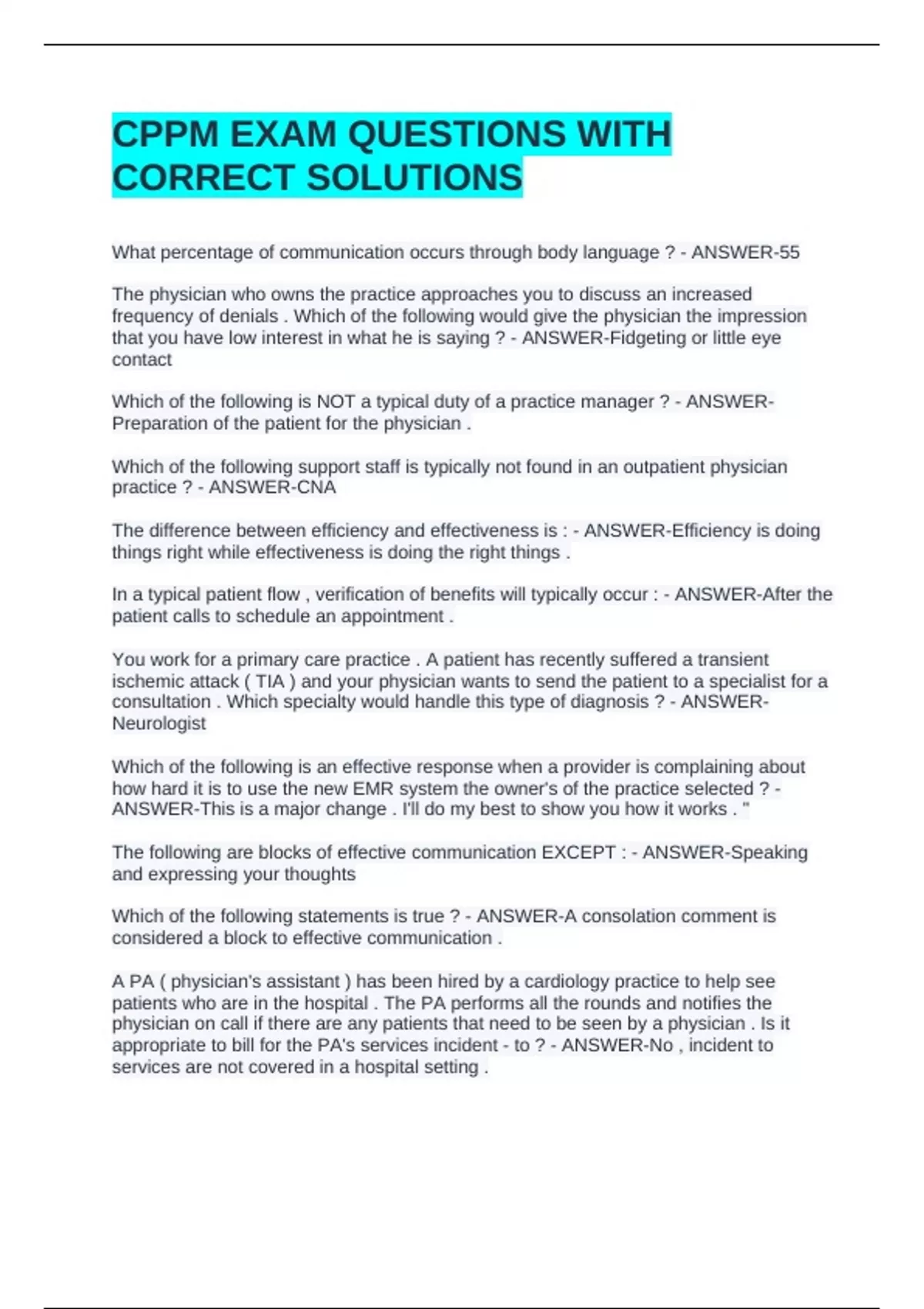 CPPM EXAM QUESTIONS WITH CORRECT SOLUTIONSCPPM EXAM QUESTIONS WITH CORRECT SOLUTIONSCPPM EXAM QUESTIONS WITH CORRECT SOLUTIONSCPPM EXAM QUESTIONS WITH CORRECT SOLUTIONS What percentage of communication occurs through body language ? - ANSWER-55 The physician who owns the practice approaches you to discuss an increased frequency of denials . Which of the following would give the physician the impression that you have low interest in what he is saying ? - ANSWER-Fidgeting or little eye contact Which of the following is NOT a typical duty of a practice manager ? - ANSWER-Preparation of the patient for the physician . Which of the following support staff is typically not found in an outpatient physician practice ? - ANSWER-CNA The difference between efficiency and effectiveness is : - ANSWER-Efficiency is doing things right while effectiveness is doing the right things .