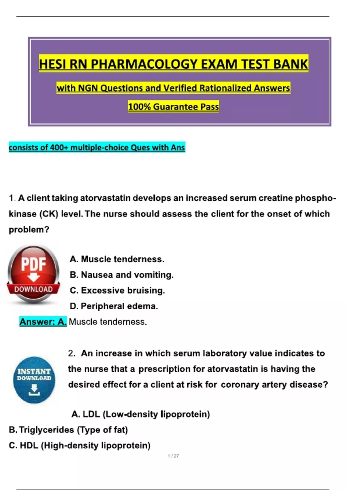 (2024 / 2025) RN Pharmacology Hesi Exam TEST BANK (400+ Ques & Ans) with Questions and Verified Rationalized Answers, 100% Guarantee Pass