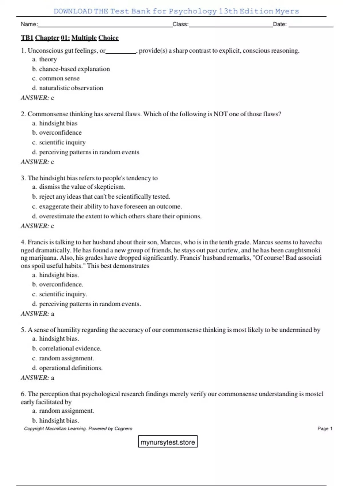 , DOWNLOAD THE Test Bank for Psychology 13th Edition Myers