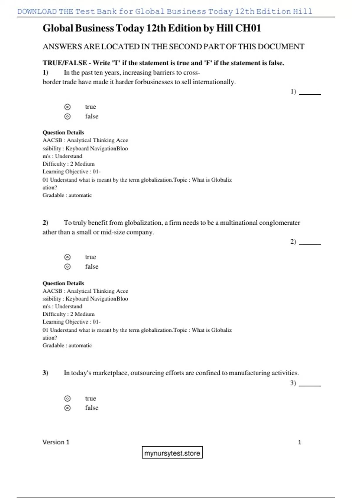 , DOWNLOAD THE Test Bank for Global Business Today 12th Edition Hill