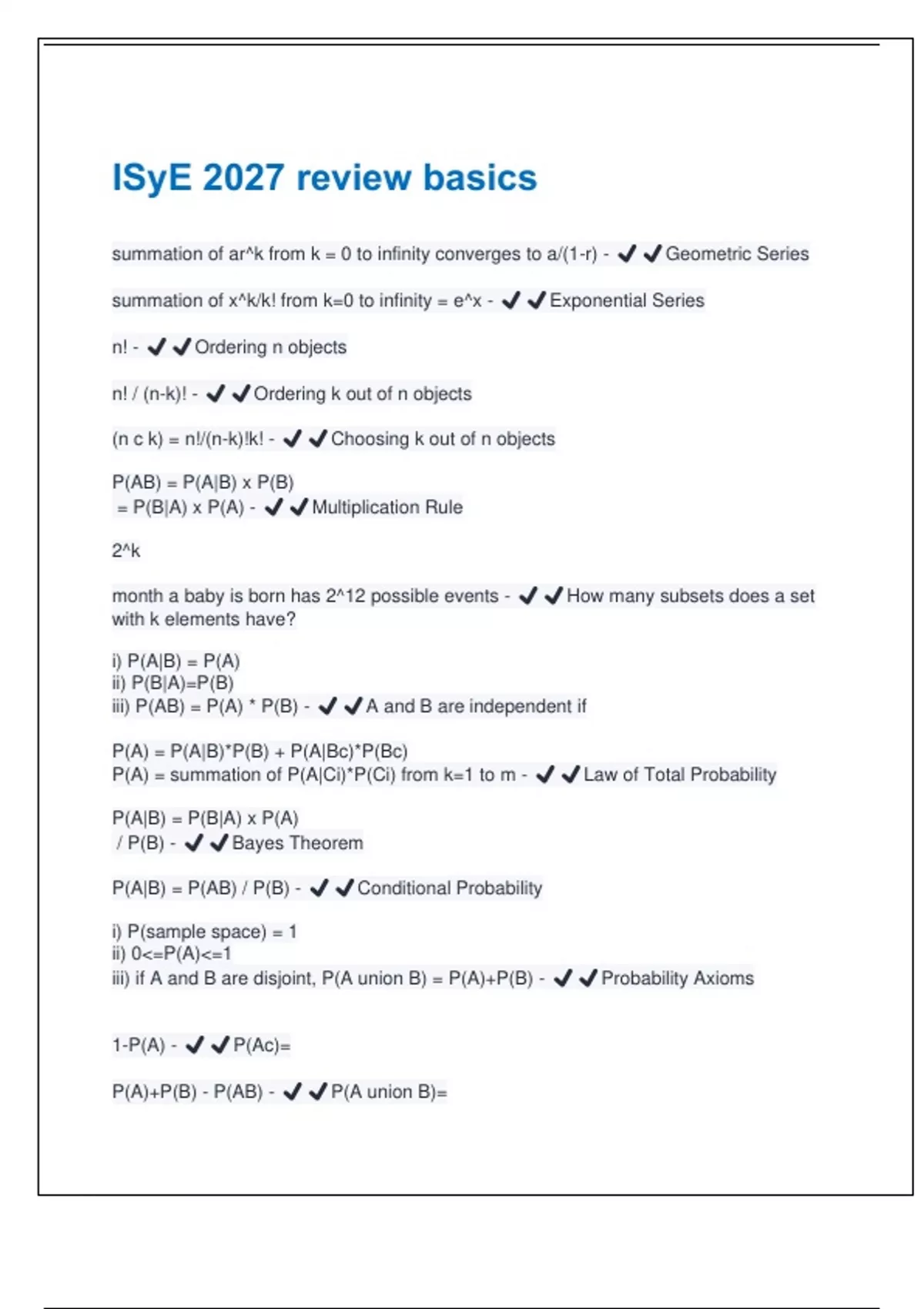 summation of ar^k from k = 0 to infinity converges to a/(1-r) - ️️Geometric Series summation of x^k/k! from k=0 to infinity = e^x - ️️Exponential Series n! - ️️Ordering n objects n! / (n-k)! - ️️Ordering k out of n objects (n c k) = n!/(n-k)!k! - ️️Choosing k out of n objects P(AB) = P(A|B) x P(B) = P(B|A) x P(A) - ️️Multiplication Rule 2^k month a baby is born has 2^12 possible events - ️️How many subsets does a set with k elements have? i) P(A|B) = P(A) ii) P(B|A)=P(B) iii) P(AB) = P(A) * P(B) - ️️A and B are independent if P(A) = P(A|B)*P(B) + P(A|Bc)*P(Bc) P(A) = summation of P(A|Ci)*P(Ci) from k=1 to m - ️️Law of Total Probability P(A|B) = P(B|A) x P(A) / P(B) - ️️Bayes Theorem