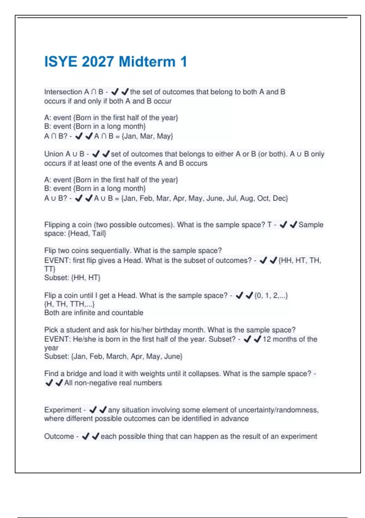 Intersection A ∩ B - ️️the set of outcomes that belong to both A and B occurs if and only if both A and B occur A: event {Born in the first half of the year} B: event {Born in a long month} A ∩ B? - ️️A ∩ B = {Jan, Mar, May} Union A ∪ B - ️️set of outcomes that belongs to either A or B (or both). A ∪ B only occurs if at least one of the events A and B occurs A: event {Born in the first half of the year} B: event {Born in a long month} A ∪ B? - ️️A ∪ B = {Jan, Feb, Mar, Apr, May, June, Jul, Aug, Oct, Dec} Flipping a coin (two possible outcomes). What is the sample space? T - ️️Sample space: {Head, Tail} Flip two coins sequentially. What is the sample space? EVENT: first flip gives a Head. What is the subset of outcomes? - ️️{HH, HT, TH, TT} Subset: {HH, HT} Flip a coin until I get a Head. What is the sample space? - ️️{0, 1, 2,...} {H, TH, TTH,...} Both are infinite and countable