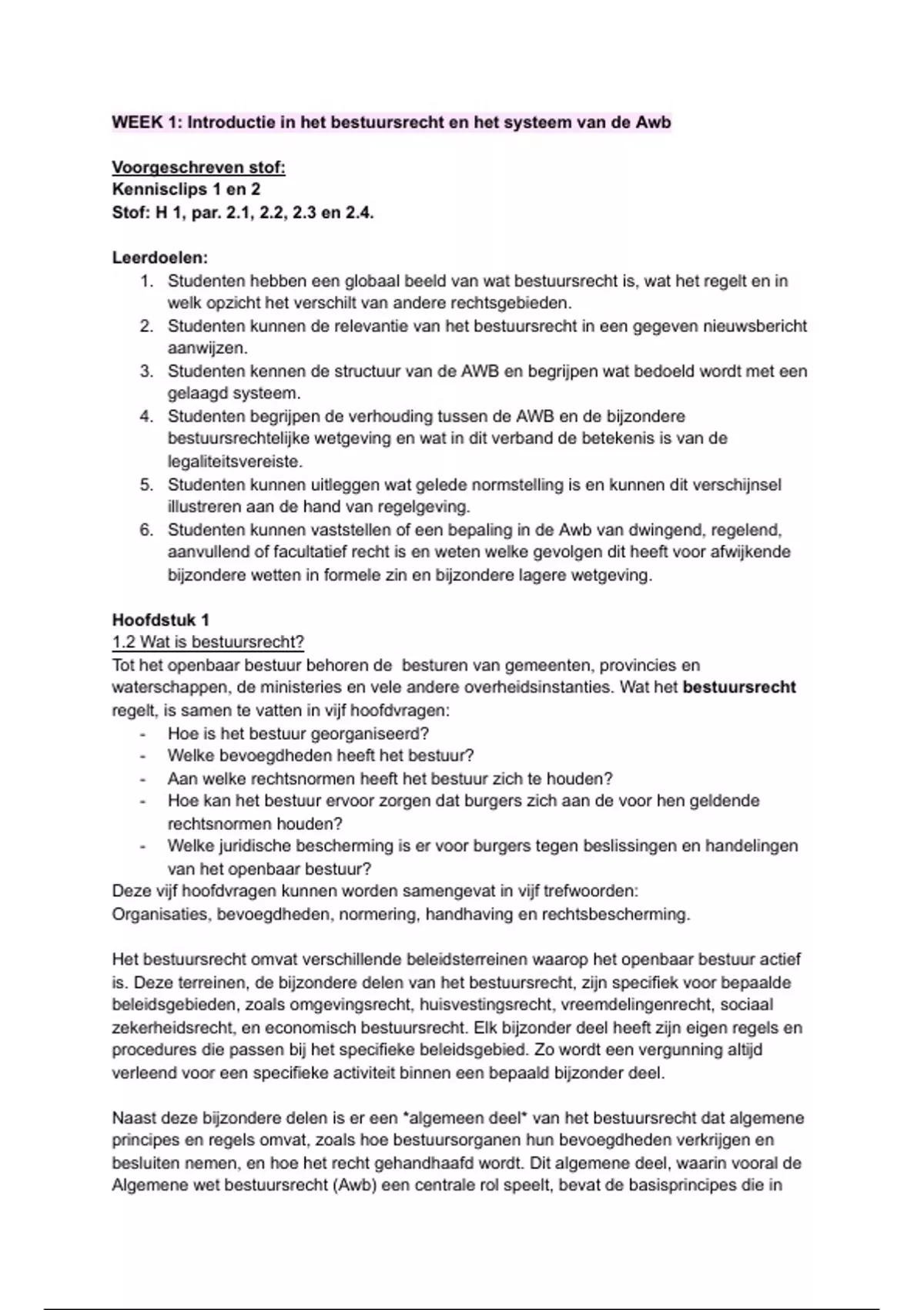 1. Studenten hebben een globaal beeld van wat bestuursrecht is, wat het regelt en in
