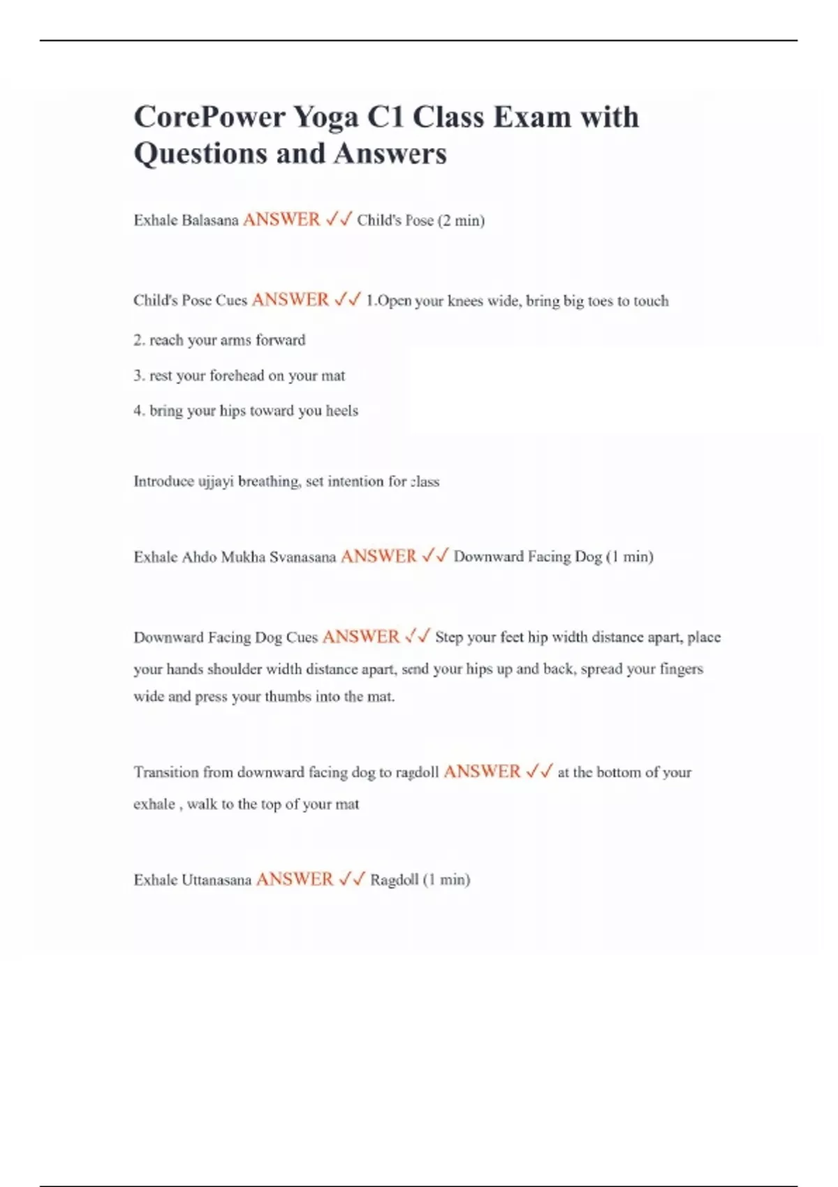 CorePower Yoga C1 Class Exam with Questions and Answers Exhale Balasana ANSWER Child's Pose (2 min) Child's Pose Cues ANSWER 1.Open your knees wide, bring big toes to touch 2. reach your arms forward 3. rest your forehead on your mat 4. bring your hips toward you heels Introduce ujjayi breathing, set intention for class Exhale Ahdo Mukha Svanasana ANSWER Downward Facing Dog (1 min) Downward Facing Dog Cues ANSWER Step your feet hip width distance apart, place your hands shoulder width distance apart, send your hips up and back, spread your fingers wide and press your thumbs into the mat. Transition from downward facing dog to ragdoll ANSWER at the bottom of your exhale , walk to the top of your mat Exhale Uttanasana ANSWER Ragdoll (1 min) Ragdoll cues ANSWER step your feet hip width distance apart, hang your torso over