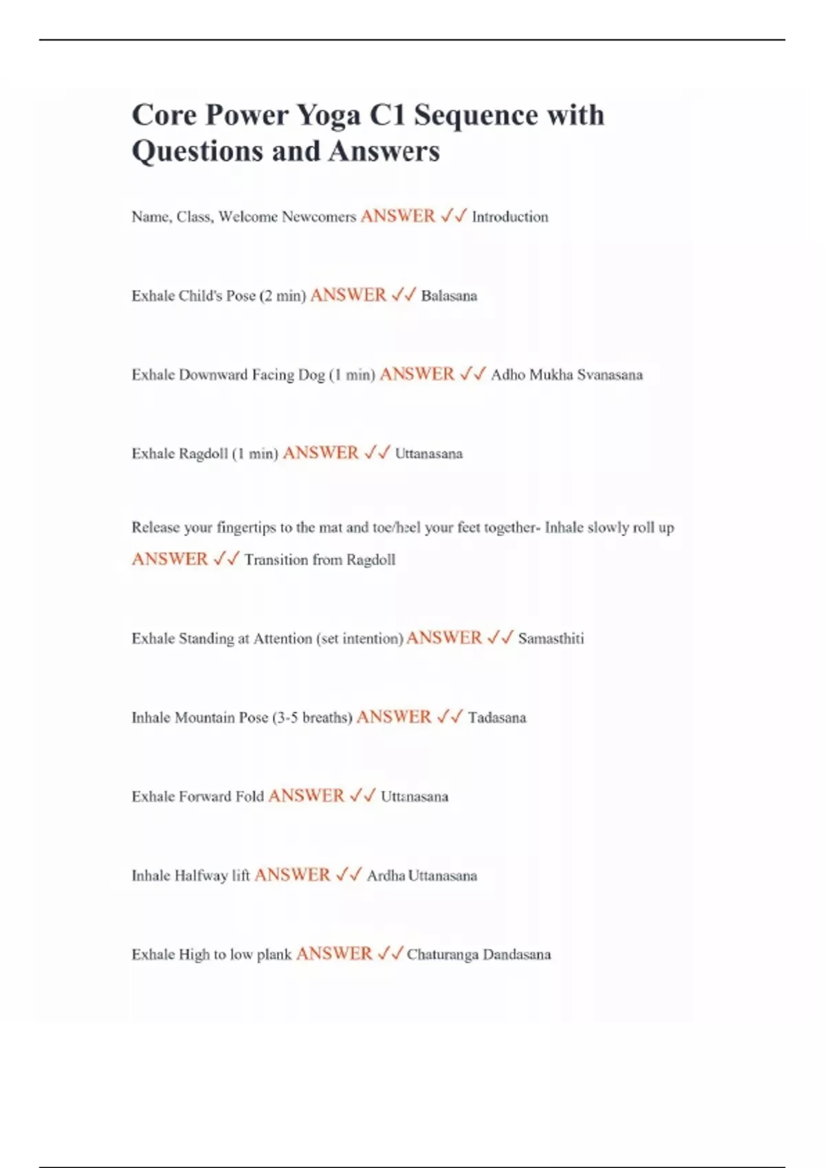 Core Power Yoga C1 Sequence with Questions and Answers Name, Class, Welcome Newcomers ANSWER Introduction Exhale Child's Pose (2 min) ANSWER Balasana Exhale Downward Facing Dog (1 min) ANSWER Adho Mukha Svanasana Exhale Ragdoll (1 min) ANSWER Uttanasana Release your fingertips to the mat and toe/heel your feet together- Inhale slowly roll up ANSWER Transition from Ragdoll Exhale Standing at Attention (set intention) ANSWER Samasthiti Inhale Mountain Pose (3-5 breaths) ANSWER Tadasana Exhale Forward Fold ANSWER Uttanasana Inhale Halfway lift ANSWER Ardha Uttanasana Exhale High to low plank ANSWER Chaturanga Dandasana