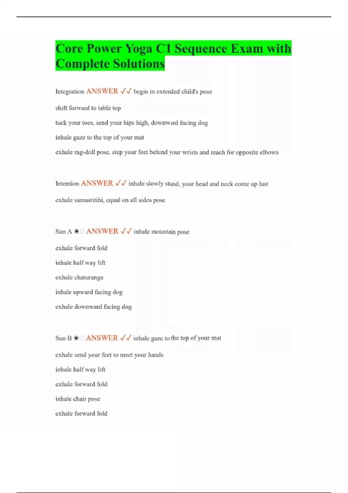 Core Power Yoga C1 Sequence Exam with Complete Solutions
