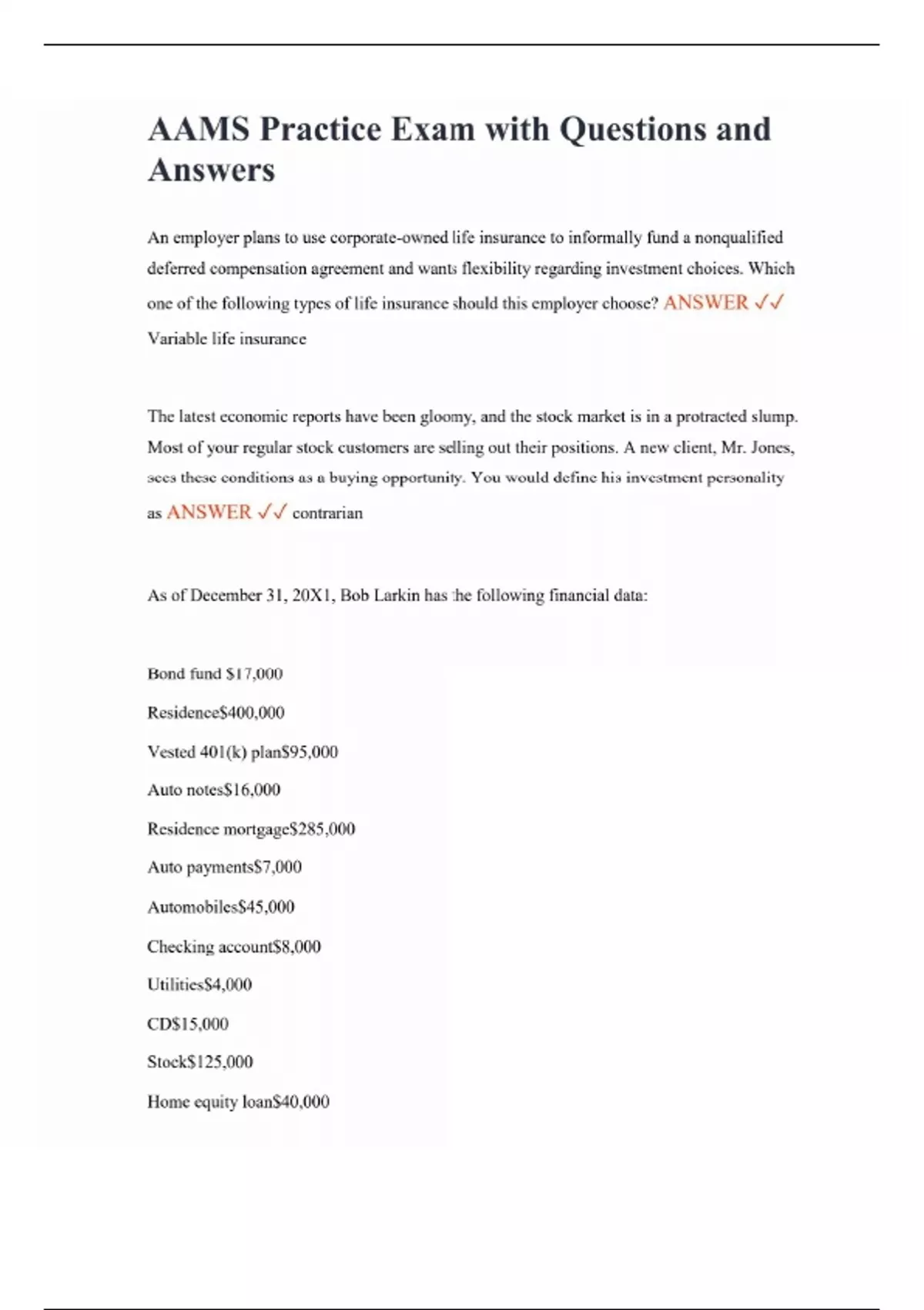 AAMS Practice Exam with Questions and Answers An employer plans to use corporate-owned life insurance to informally fund a nonqualified deferred compensation agreement and wants flexibility regarding investment choices. Which one of the following types of life insurance should this employer choose? ANSWER Variable life insurance The latest economic reports have been gloomy, and the stock market is in a protracted slump. Most of your regular stock customers are selling out their positions. A new client, Mr. Jones, sees these conditions as a buying opportunity. You would define his investment personality as ANSWER contrarian As of December 31, 20X1, Bob Larkin has the following financial data: Bond fund $17,000 Residence$400,000 Vested 401(k) plan$95,000 Auto notes$16,000 Residence mortgage$285,000 Auto payments$7,000 Automobiles$45,000 Checking account$8,000 Utilities$4,000 CD$15,000 Stock$125,000 Home equity loan$40,000