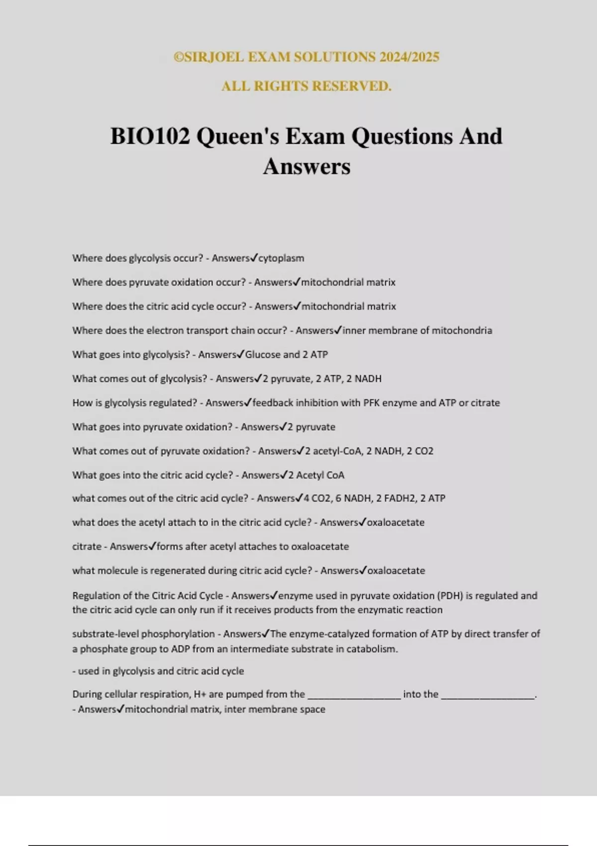 ©SIRJOEL EXAM SOLUTIONS 2024/2025 ALL RIGHTS RESERVED. BIO102 Queen's Exam Questions And Answers Where does glycolysis occur? - Answerscytoplasm Where does pyruvate oxidation occur? - Answersmitochondrial matrix Where does the citric acid cycle occur? - Answersmitochondrial matrix Where does the electron transport chain occur? - Answersinner membrane of mitochondria What goes into glycolysis? - AnswersGlucose and 2 ATP What comes out of glycolysis? - Answers2 pyruvate, 2 ATP, 2 NADH How is glycolysis regulated? - Answersfeedback inhibition with PFK enzyme and ATP or citrate What goes into pyruvate oxidation? - Answers2 pyruvate What comes out of pyruvate oxidation? - Answers2 acetyl-CoA, 2 NADH, 2 CO2 What goes into the citric acid cycle? - Answers2 Acetyl CoA what comes out of the citric acid cycle? - Answers4 CO2, 6 NADH, 2 FADH2, 2 ATP what does the acetyl attach to in the citric acid cycle? - Answersoxaloacetate citrate - Answersforms after acetyl attaches to oxaloacetate what molecule is regenerated during citric acid cycle? - Answersoxaloacetate Regulation of the Citric Acid Cycle - Answersenzyme used in pyruvate oxidation (PDH) is regulated and the citric acid cycle can only run if it receives products from the enzymatic reaction substrate-level phosphorylation - AnswersThe enzyme-catalyzed formation of ATP by direct transfer of a phosphate group to ADP from an intermediate substrate in catabolism. - used in glycolysis and citric acid cycle During cellular respiration, H+ are pumped from the _________________ into the _________________. - Answersmitochondrial matrix, inter membrane space ©SIRJOEL EXAM SOLUTIONS 2024/2025 ALL RIGHTS RESERVED. Water is created during cellular respiration when O2 takes receives electrons and takes H+ from the ________________ - Answersmatrix ATP synthase - Answers-uses the proton gradient to produce ATP through oxidative phosphorylation primary metabolism - Answersessential for cell structure and function secondary metabolism - Answerssynthesis of secondary metabolites that are not necessary for cell structure and growth lumen - Answersinner space of thylakoid Stroma - Answersfluid portion of the chloroplast; outside of the thylakoids what pigment is found in photosystem II? - AnswersP680 What reduces photosystem II? - Answerswater molecule, water molecule leaves H+ in the lumen how is oxygen produced during photosynthesis? - AnswersWater molecule splits and donates electrons to photosystem II, only leaving O2 behind What pigment is found in photosystem I? - AnswersP700 What reduces photosystem I? - AnswersPC transfers electron from PSII to PSI to neutralize it The H+ are pumped from the ___________________ to the _____________________. - Answersstroma, lumen What the the purpose of cyclic electron transport? - Answersto produce more ATP, when more ATP is needed that NADPH ____________________ and _____________________ goes into the light reaction and ____________________, _________________, and _________________ come out. - Answersenergy, H2O, O2, ATP, NADPH What are the three phases of the calvin cycle? - Answers1. carbon fixation 2. reduction 3. regeneration What enzyme is used in the first step of the calvin cycle? - Answersrubisco At the end of the reduction phase of the calvin cycle, what molecule is produce? - AnswersG3P What goes into the Calvin Cycle? - Answers3CO2, 9 ATP, NADPH What comes out of the calvin cycle? - AnswersG3P, and RuBP is regenerated C4 plants - Answerslight dependent reaction occurs in a different cell than the calvin cycle