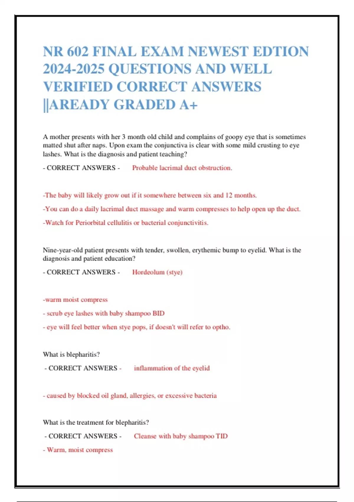 - CORRECT ANSWERS - Cleanse with baby shampoo TID