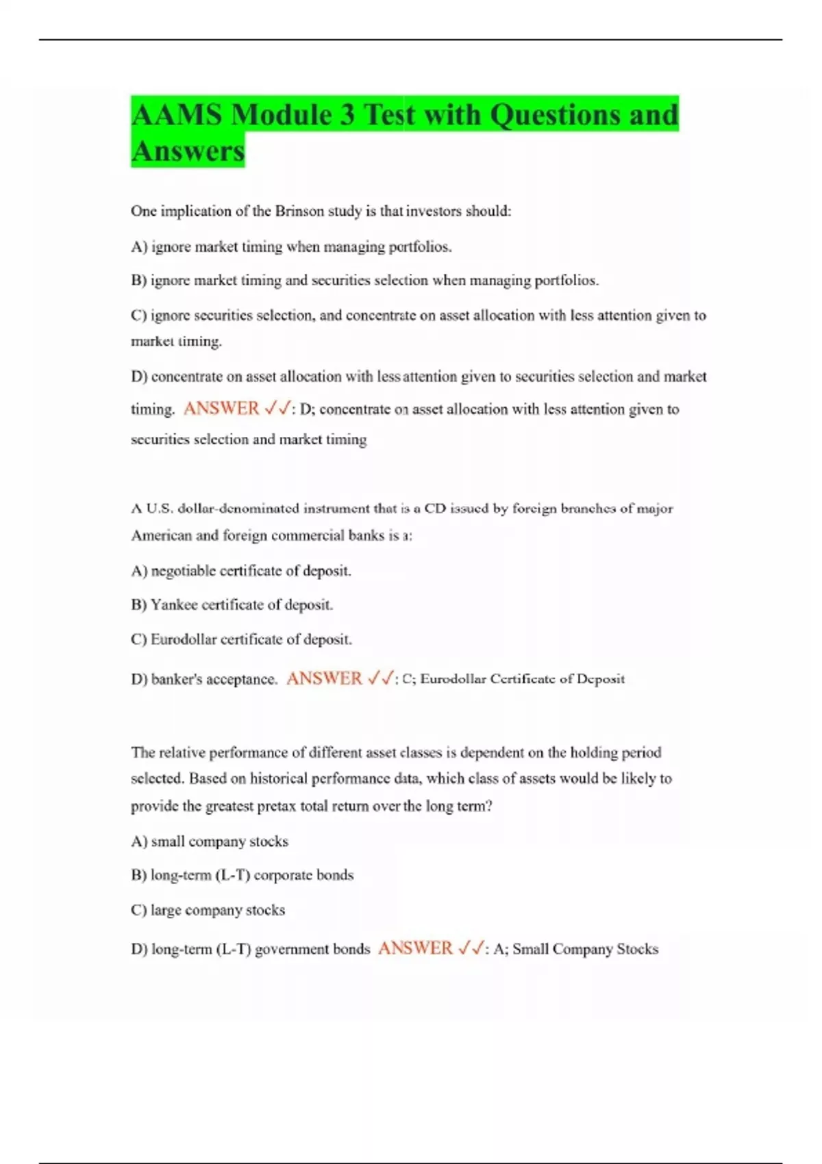 AAMS Module 3 Test with Questions and Answers One implication of the Brinson study is that investors should: A) ignore market timing when managing portfolios. B) ignore market timing and securities selection when managing portfolios. C) ignore securities selection, and concentrate on asset allocation with less attention given to market timing. D) concentrate on asset allocation with less attention given to securities selection and market timing. ANSWER : D; concentrate on asset allocation with less attention given to securities selection and market timing A U.S. dollar-denominated instrument that is a CD issued by foreign branches of major American and foreign commercial banks is a: A) negotiable certificate of deposit. B) Yankee certificate of deposit. C) Eurodollar certificate of deposit. D) banker's acceptance. ANSWER : C; Eurodollar Certificate of Deposit The relative performance of different asset classes is dependent on the holding period selected. Based on historical performance data, which class of assets would be likely to provide the greatest pretax total return over the long term? A) small company stocks B) long-term (L-T) corporate bonds C) large company stocks D) long-term (L-T) government bonds ANSWER : A; Small Company Stocks