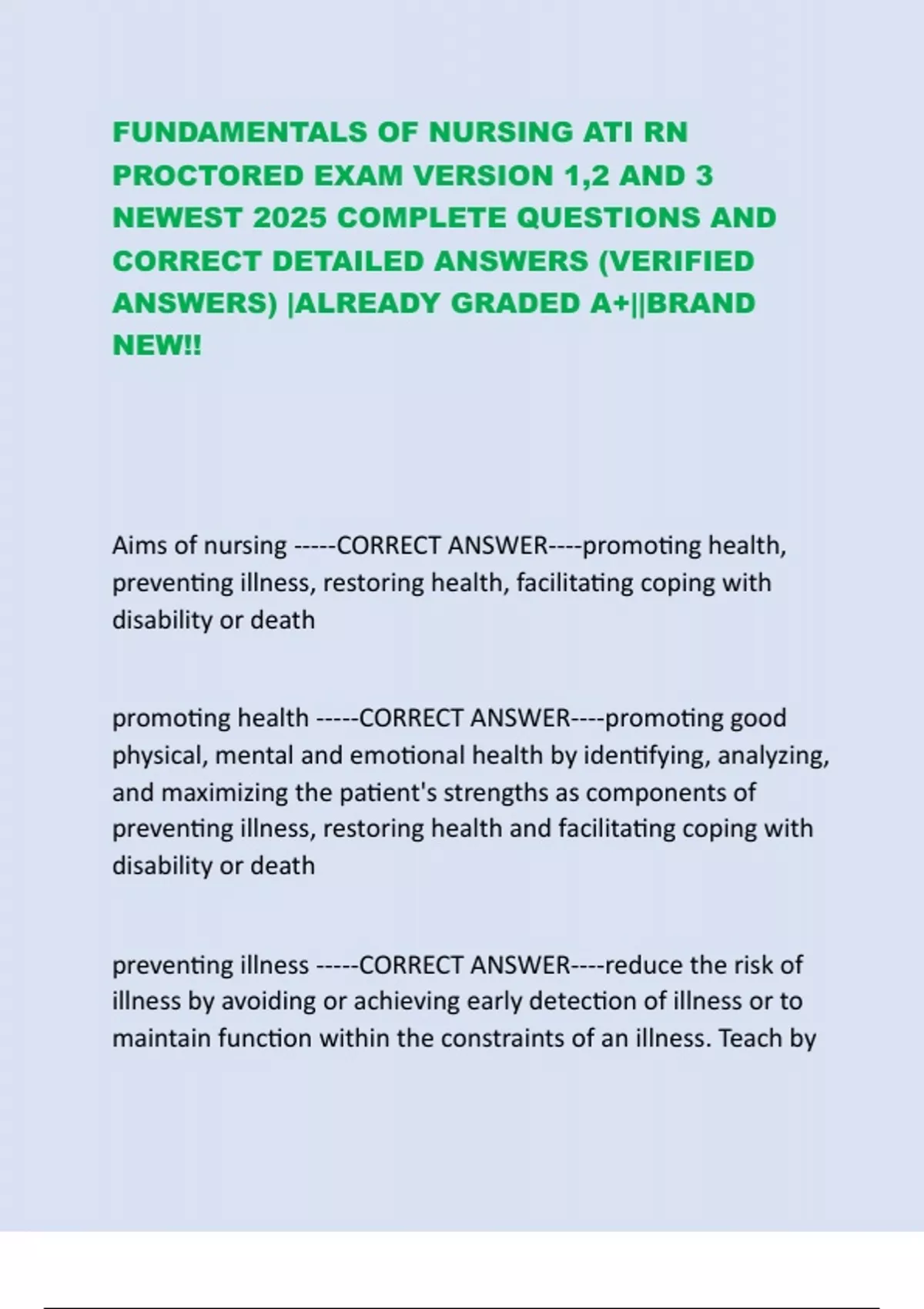 FUNDAMENTALS OF NURSING ATI RN PROCTORED EXAM VERSION 1,2 AND 3 NEWEST 2025 COMPLETE QUESTIONS AND CORRECT DETAILED ANSWERS (VERIFIED ANSWERS) |ALREADY GRADED A+||BRAND NEW!! Aims of nursing -----CORRECT ANSWE