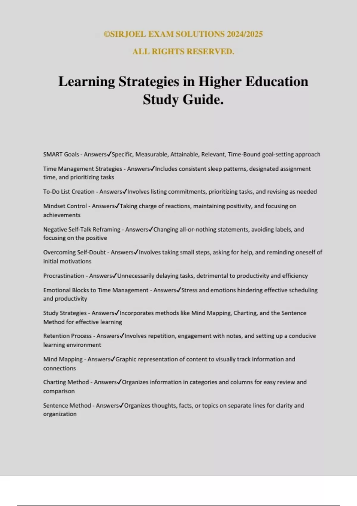 ©SIRJOEL EXAM SOLUTIONS 2024/2025 ALL RIGHTS RESERVED. Learning Strategies in Higher Education Study Guide. SMART Goals - AnswersSpecific, Measurable, Attainable, Relevant, Time-Bound goal-setting approach Time Management Strategies - AnswersIncludes consistent sleep patterns, designated assignment time, and prioritizing tasks To-Do List Creation - AnswersInvolves listing commitments, prioritizing tasks, and revising as needed Mindset Control - AnswersTaking charge of reactions, maintaining positivity, and focusing on achievements Negative Self-Talk Reframing - AnswersChanging all-or-nothing statements, avoiding labels, and focusing on the positive Overcoming Self-Doubt - AnswersInvolves taking small steps, asking for help, and reminding oneself of initial motivations Procrastination - AnswersUnnecessarily delaying tasks, detrimental to productivity and efficiency Emotional Blocks to Time Management - AnswersStress and emotions hindering effective scheduling and productivity Study Strategies - AnswersIncorporates methods like Mind Mapping, Charting, and the Sentence Method for effective learning Retention Process - AnswersInvolves repetition, engagement with notes, and setting up a conducive learning environment Mind Mapping - AnswersGraphic representation of content to visually track information and connections Charting Method - AnswersOrganizes information in categories and columns for easy review and comparison Sentence Method - AnswersOrganizes thoughts, facts, or topics on separate lines for clarity and organization