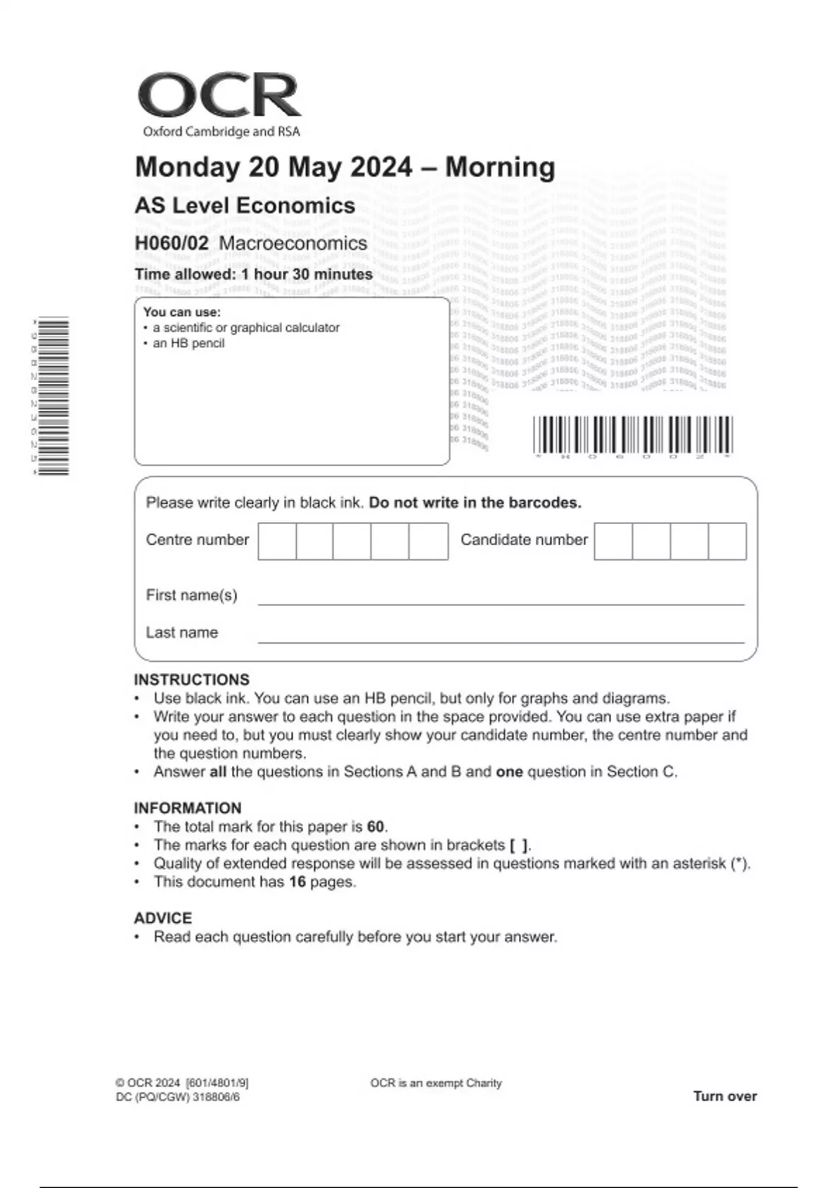 OCR AS Level Economics H060/02 JUNE 2024 QUESTION PAPER: Macroeconomics