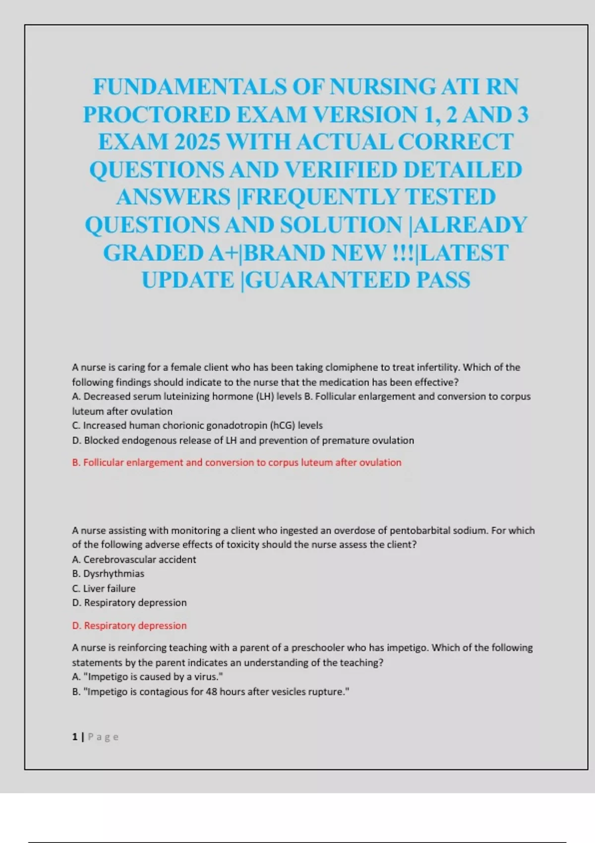 FUNDAMENTALS OF NURSING ATI RN PROCTORED EXAM VERSION 1, 2 AND 3 EXAM 2025 WITH ACTUAL CORRECT QUESTIONS AND VERIFIED DETAILED ANSWERS |FREQUENTLY TESTED QUESTIONS AND SOLUTION |ALREADY GRADED A+|BRAND NEW !!!|LATEST UPDATE |GUARANTEED PAS