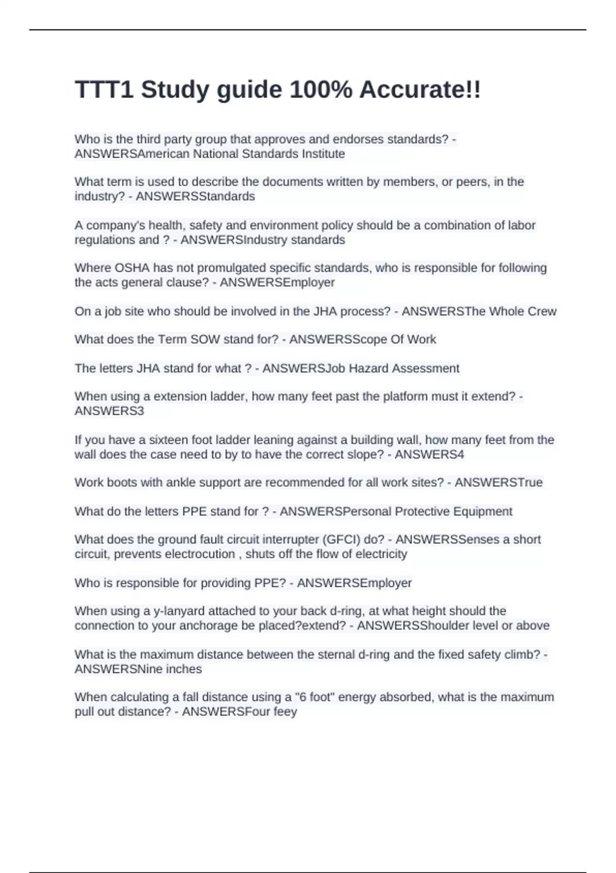 Who is the third party group that approves and endorses standards? - ANSWERSAmerican National Standards Institute What term is used to describe the documents written by members, or peers, in the industry? - ANSWERSStandards A company's health, safety and environment policy should be a combination of labor regulations and ? - ANSWERSIndustry standards Where OSHA has not promulgated specific standards, who is responsible for following the acts general clause? - ANSWERSEmployer On a job site who should be involved in the JHA process? - ANSWERSThe Whole Crew What does the Term SOW stand for? - ANSWERSScope Of Work The letters JHA stand for what ? - ANSWERSJob Hazard Assessment When using a extension ladder, how many feet past the platform must it extend? - ANSWERS3 If you have a sixteen foot ladder leaning against a building wall, how many feet from the wall does the case need to by to have the correct slope? - ANSWERS4 Work boots with ankle support are recommended for all work sites? - ANSWERSTrue What do the letters PPE stand for ? - ANSWERSPersonal Protective Equipment What does the ground fault circuit interrupter (GFCI) do? - ANSWERSSenses a short circuit, prevents electrocution , shuts off the flow of electricity Who is responsible for providing PPE? - ANSWERSEmployer