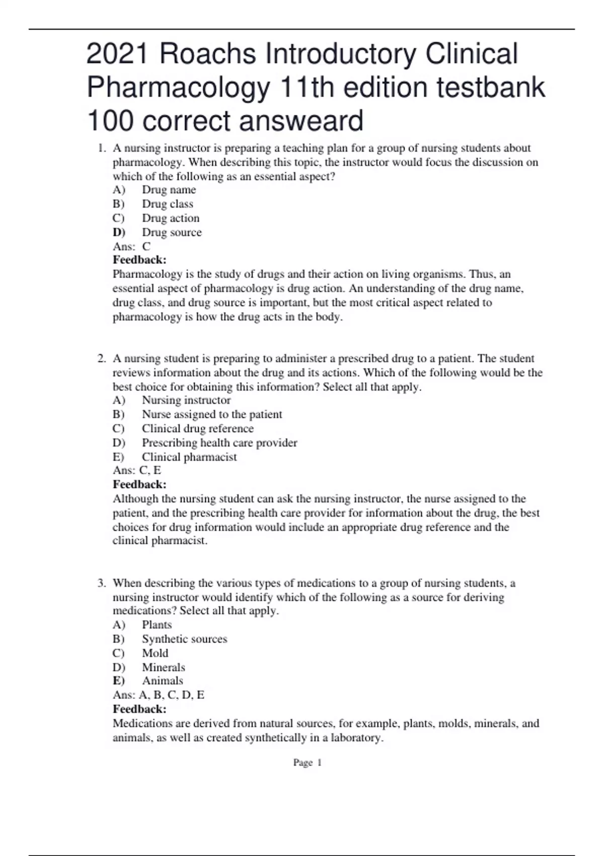 2021 Roachs Introductory Clinical Pharmacology 11th edition testbank 100 correct answeard