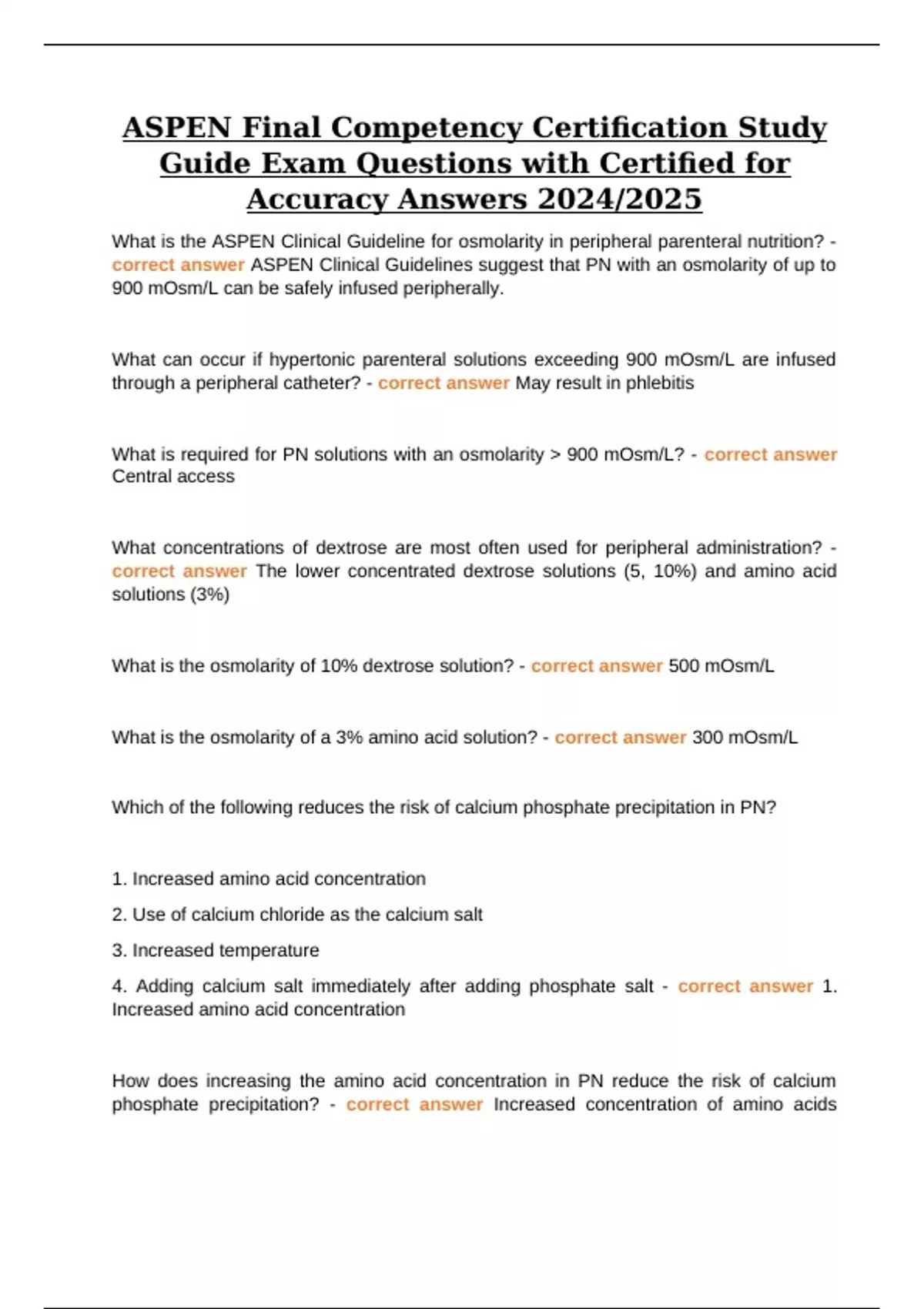 ASPEN Final Competency Certification Study Guide Exam Questions with Certified for Accuracy Answers 2024/2025 What is the ASPEN Clinical Guideline for osmolarity in peripheral parenteral nutrition? - correct answer ASPEN Clinical Guidelines suggest that PN with an osmolarity of up to 900 mOsm/L can be safely infused peripherally. What can occur if hypertonic parenteral solutions exceeding 900 mOsm/L are infused through a peripheral catheter? - correct answer May result in phlebitis What is required for PN solutions with an osmolarity > 900 mOsm/L? - correct answer Central access What concentrations of dextrose are most often used for peripheral administration? - correct answer The lower concentrated dextrose solutions (5, 10%) and amino acid solutions (3%) What is the osmolarity of 10% dextrose solution? - correct answer 500 mOsm/L What is the osmolarity of a 3% amino acid solution? - correct answer 300 mOsm/L Which of the following reduces the risk of calcium phosphate precipitation in PN? 1. Increased amino acid concentration 2. Use of calcium chloride as the calcium salt 3. Increased temperature 4. Adding calcium salt immediately after adding phosphate salt - correct answer 1. Increased amino acid concentration How does increasing the amino acid concentration in PN reduce the risk of calcium phosphate precipitation? - correct answer Increased concentration of amino acids reduces the risk of calcium phosphate precipitation by forming soluble complexes with calcium, thereby reducing the free calcium ions available to form insoluble dibasic calcium phosphate precipitates. Additionally, higher concentrations of amino acids may lower the pH of the PN formulation, which also improves calcium phosphate solubility. How do the different forms of calcium (calcium chloride vs. calcium gluconate) impact calcium phosphate precipitation? - correct answer Calcium chloride dissociated more readily than calcium gluconate, increasing the free calcium ions available to bind with phosphate ions when using calcium chloride How does temperature impact calcium phosphate precipitation? - correct answer Increasing temperature increases the dissociation of calcium salts. Storage under refrigeration reduces risk of calcium phosphate precipitation.