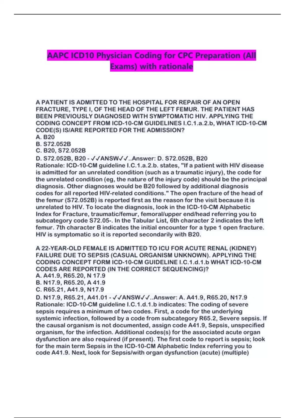 D. N17.9, R65.21, A41.01 - ✔✔ANSW✔✔..Answer: A. A41.9, R65.20, N17.9
