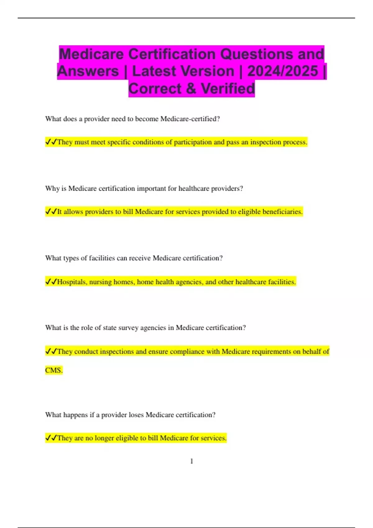 Medicare Certification Questions and Answers | Latest Version | 2024/2025 | Correct & Verified What does a provider need to become Medicare-certified? They must meet specific conditions of participation and pass an inspection process. Why is Medicare certification important for healthcare providers? It allows providers to bill Medicare for services provided to eligible beneficiaries. What types of facilities can receive Medicare certification? Hospitals, nursing homes, home health agencies, and other healthcare facilities. What is the role of state survey agencies in Medicare certification? They conduct inspections and ensure compliance with Medicare requirements on behalf of CMS. What happens if a provider loses Medicare certification? They are no longer eligible to bill Medicare for services. 2 How does a provider maintain Medicare certification? By adhering to Medicare's quality standards and passing regular inspections. What is a Medicare Administrative Contractor (MAC)? An organization that processes Medicare claims and assists with provider certification. Why might CMS deny Medicare certification to a provider? If the provider fails to meet the conditions of participation or comply with Medicare regulations. What is the impact of Medicare certification on patients? It ensures that patients receive care from providers that meet federal quality standards. What is the certification process for a new provider? They must apply to CMS, pass a survey or inspection, and meet all Medicare requirements. How often are Medicare-certified providers inspected? 3 Typically every few years, depending on the type of provider and state requirements. What are the Conditions of Participation (CoPs)? Regulatory standards that providers must meet to participate in Medicare. How do Medicare certification requirements differ for hospitals and home health agencies? Each type of provider has specific Conditions of Participation based on the services they offer. What is the primary focus of Medicare certification inspections? To ensure patient safety, quality