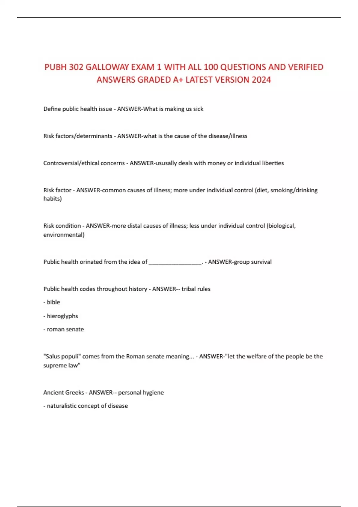 PUBH 302 GALLOWAY EXAM 1 WITH ALL 100 QUESTIONS AND VERIFIED ANSWERS GRADED A+ LATEST VERSION 2024