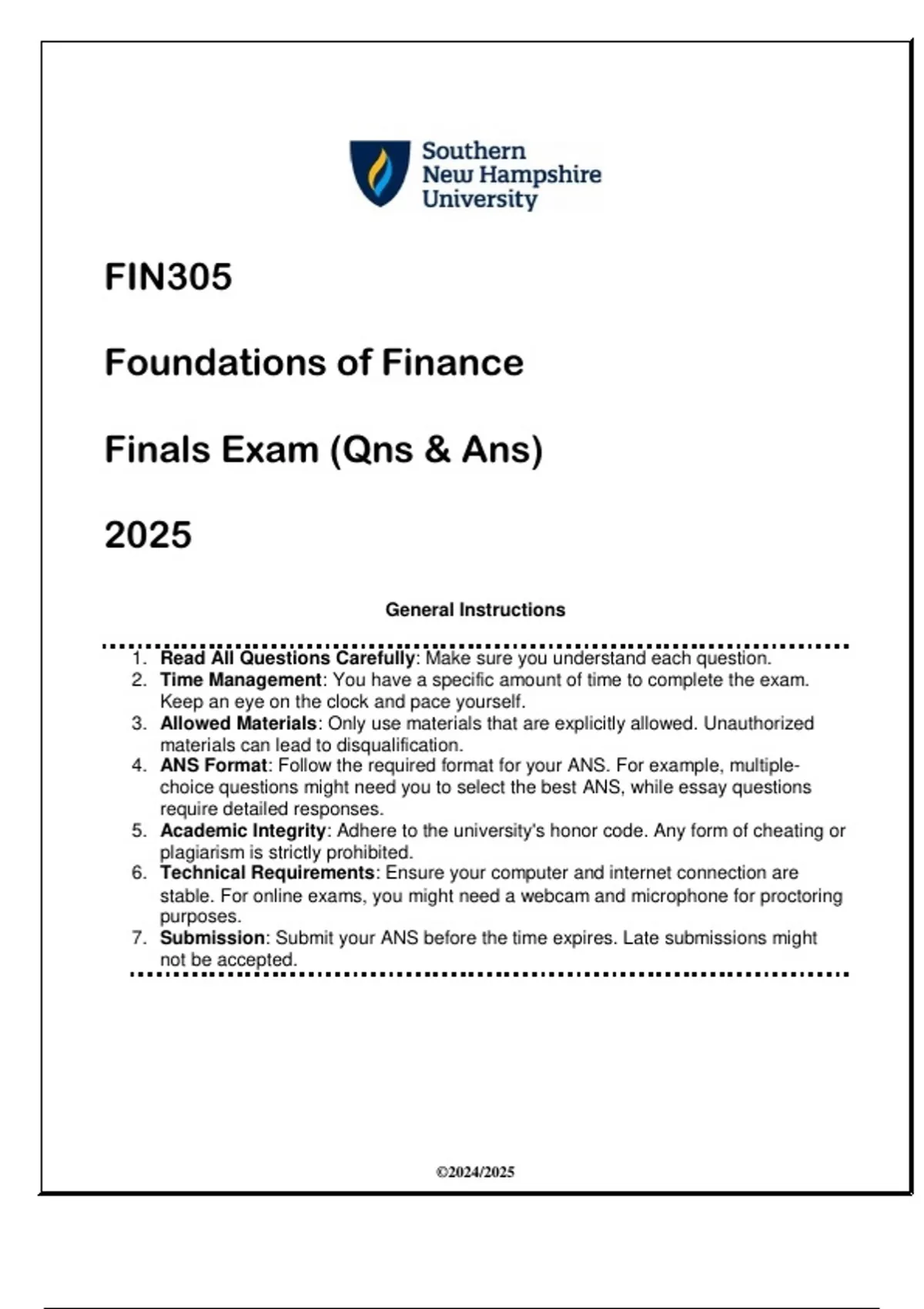 (SNHU) FIN305 Foundations of Finance Finals Exam ( Qns & Ans) 2025.(SNHU) FIN305 Foundations of Finance Finals Exam ( Qns & Ans) 2025.(SNHU) FIN305 Foundations of Finance Finals Exam ( Qns & Ans) 2025.