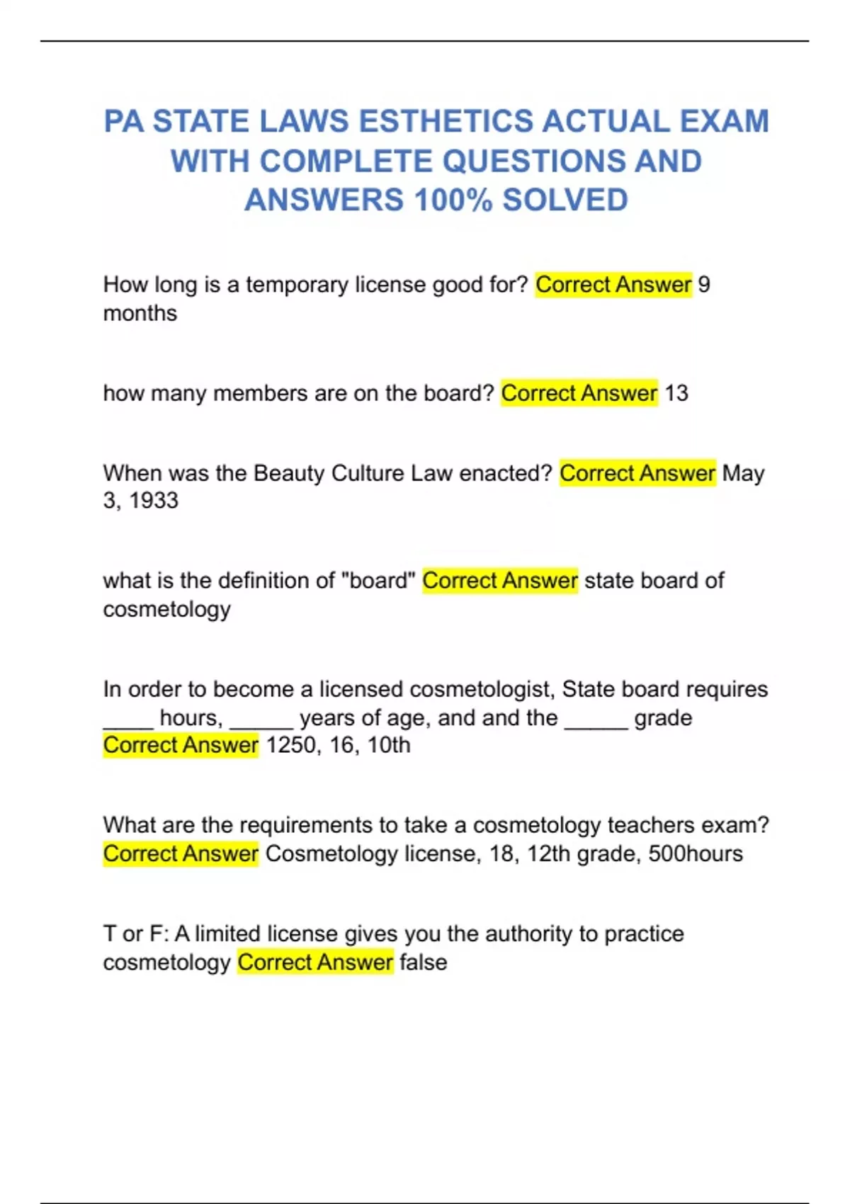 PA STATE LAWS ESTHETICS ACTUAL EXAM WITH COMPLETE QUESTIONS AND ANSWERS 100% SOLVED