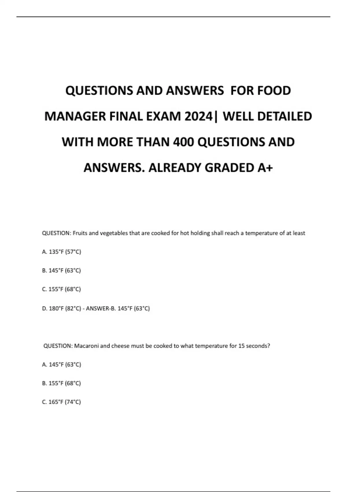 QUESTIONS AND ANSWERS FOR FOOD MANAGER FINAL EXAM 2024| WELL DETAILED WITH MORE THAN 400 QUESTIONS AND ANSWERS. ALREADY GRADED A+