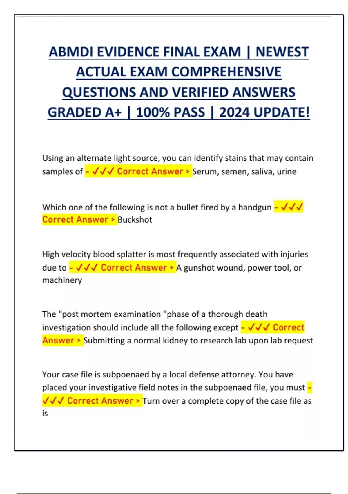 ABMDI EVIDENCE FINAL EXAM | NEWEST ACTUAL EXAM COMPREHENSIVE QUESTIONS AND VERIFIED ANSWERS GRADED A+ | 100% PASS | 2024 UPDATE!