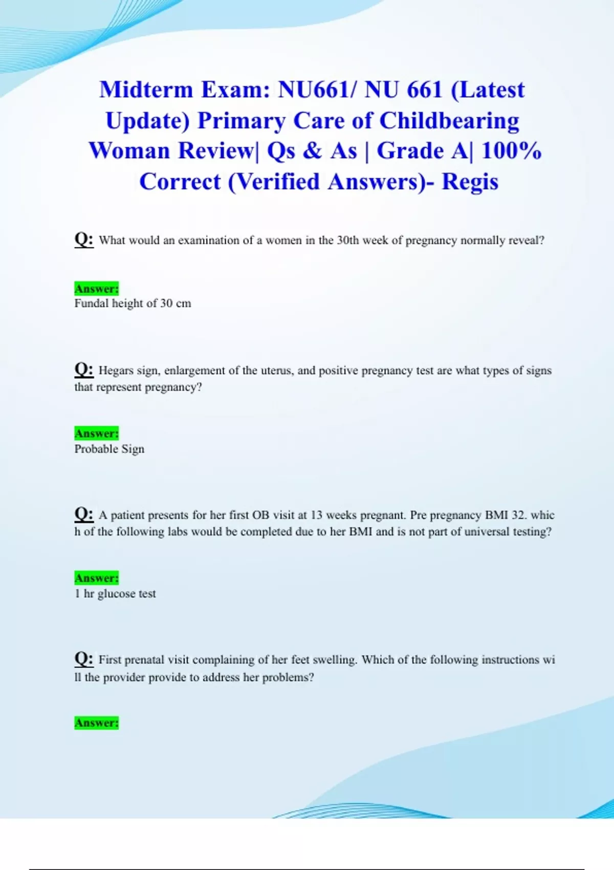 Midterm Exam: NU661/ NU 661 (Latest 2024/ 2025 Update) Primary Care of Childbearing Woman Review| Qs & As | Grade A| 100% Correct (Verified Answers)- Regis