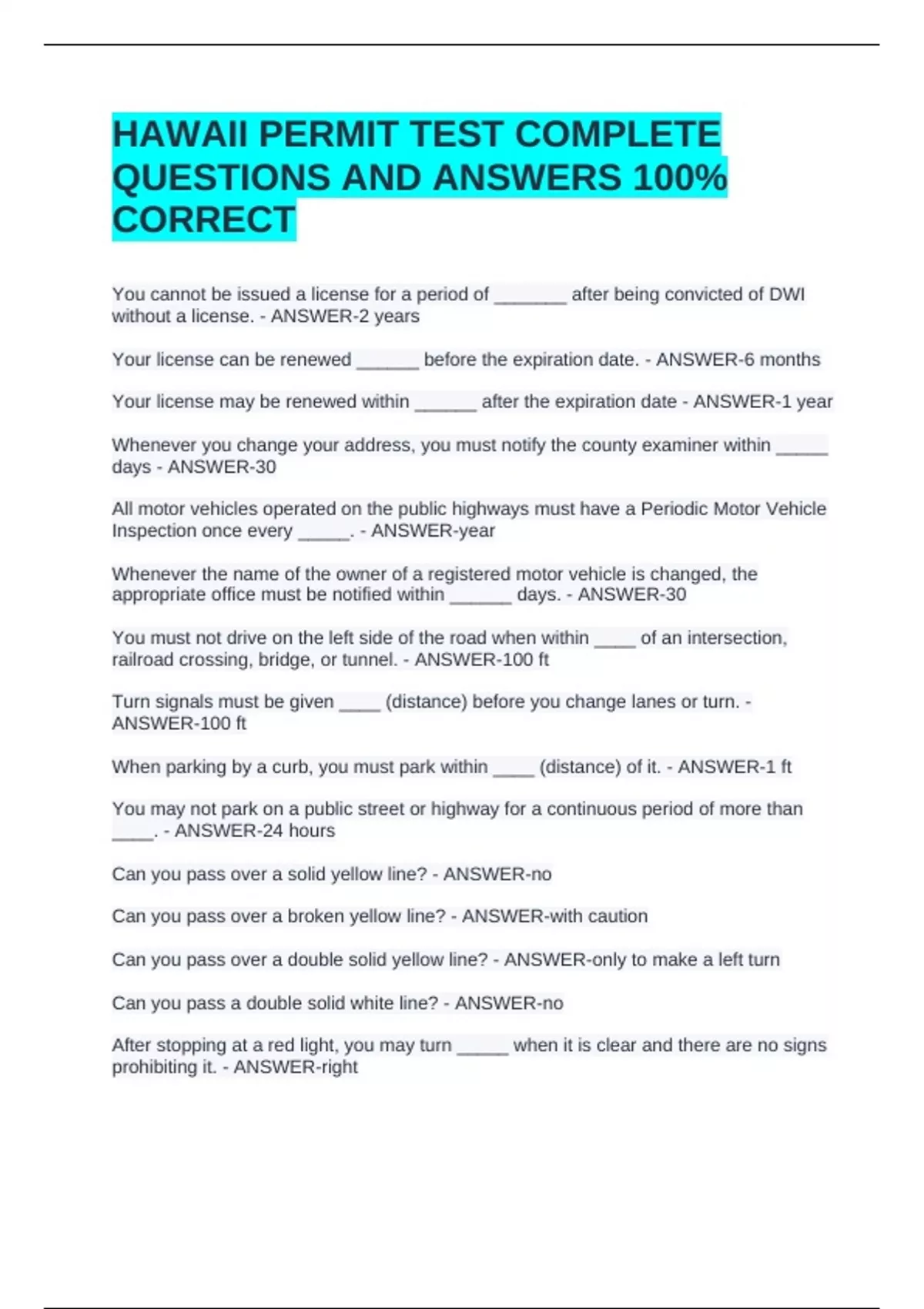 HAWAII PERMIT TEST COMPLETE QUESTIONS AND ANSWERS 100% CORRECTHAWAII PERMIT TEST COMPLETE QUESTIONS AND ANSWERS 100% CORRECTHAWAII PERMIT TEST COMPLETE QUESTIONS AND ANSWERS 100% CORRECTYou cannot be issued a license for a period of _______ after being convicted of DWI without a license. - ANSWER-2 years Your license can be renewed ______ before the expiration date. - ANSWER-6 months Your license may be renewed within ______ after the expiration date - ANSWER-1 year Whenever you change your address, you must notify the county examiner within _____ days - ANSWER-30 All motor vehicles operated on the public highways must have a Periodic Motor Vehicle Inspection once every _____. - ANSWER-year