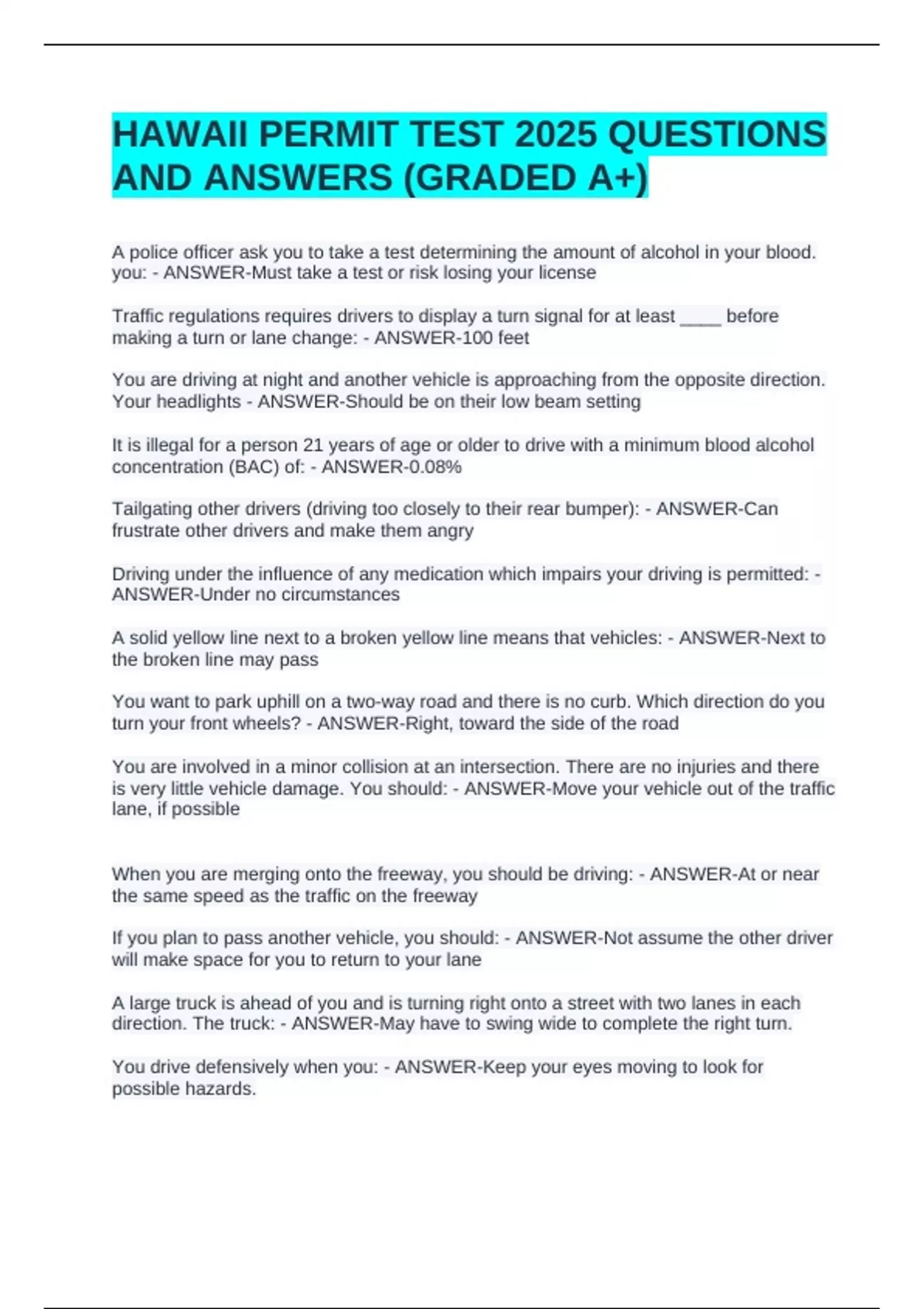 HAWAII PERMIT TEST 2025 QUESTIONS AND ANSWERS (GRADED A+)HAWAII PERMIT TEST 2025 QUESTIONS AND ANSWERS (GRADED A+)HAWAII PERMIT TEST 2025 QUESTIONS AND ANSWERS (GRADED A+)HAWAII PERMIT TEST 2025 QUESTIONS AND ANSWERS (GRADED A+)A police officer ask you to take a test determining the amount of alcohol in your blood. you: - ANSWER-Must take a test or risk losing your license Traffic regulations requires drivers to display a turn signal for at least ____ before making a turn or lane change: - ANSWER-100 feet You are driving at night and another vehicle is approaching from the opposite direction. Your headlights - ANSWER-Should be on their low beam setting It is illegal for a person 21 years of age or older to drive with a minimum blood alcohol concentration (BAC) of: - ANSWER-0.08%
