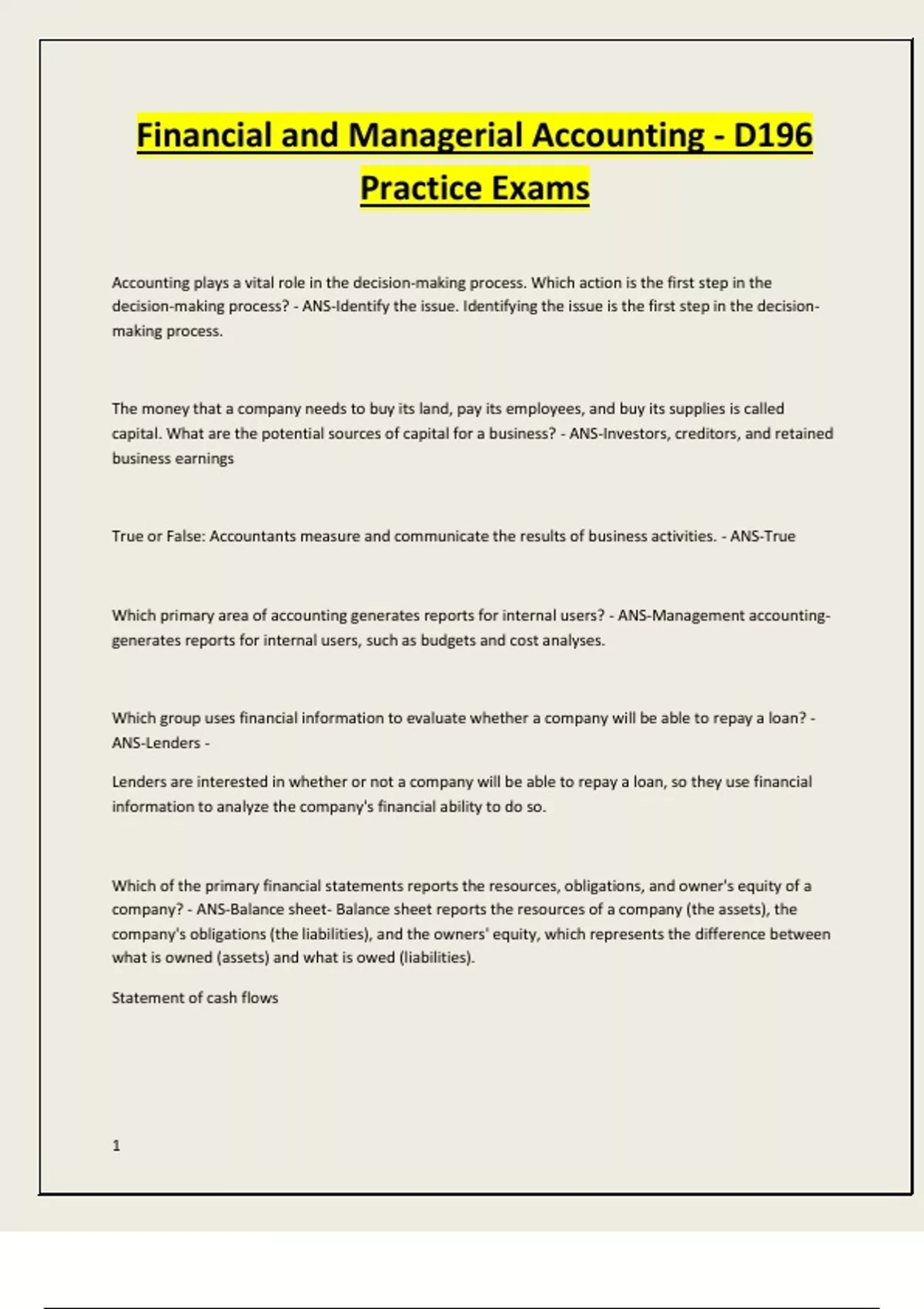 Financial and Managerial Accounting - D196 Practice Exams