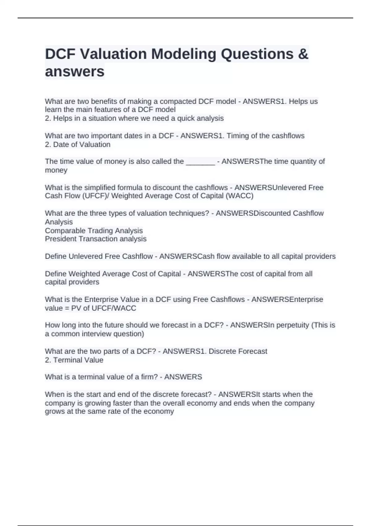 What are two benefits of making a compacted DCF model - ANSWERS1. Helps us learn the main features of a DCF model 2. Helps in a situation where we need a quick analysis What are two important dates in a DCF - ANSWERS1. Timing of the cashflows 2. Date of Valuation The time value of money is also called the _______ - ANSWERSThe time quantity of money What is the simplified formula to discount the cashflows - ANSWERSUnlevered Free Cash Flow (UFCF)/ Weighted Average Cost of Capital (WACC) What are the three types of valuation techniques? - ANSWERSDiscounted Cashflow Analysis Comparable Trading Analysis President Transaction analysis Define Unlevered Free Cashflow - ANSWERSCash flow available to all capital providers Define Weighted Average Cost of Capital - ANSWERSThe cost of capital from all capital providers What is the Enterprise Value in a DCF using Free Cashflows - ANSWERSEnterprise value = PV of UFCF/WACC How long into the future should we forecast in a DCF? - ANSWERSIn perpetuity (This is a common interview question) What are the two parts of a DCF? - ANSWERS1. Discrete Forecast 2. Terminal Value What is a terminal value of a firm? - ANSWERS When is the start and end of the discrete forecast? - ANSWERSIt starts when the company is growing faster than the overall economy and ends when the company grows at the same rate of the economy